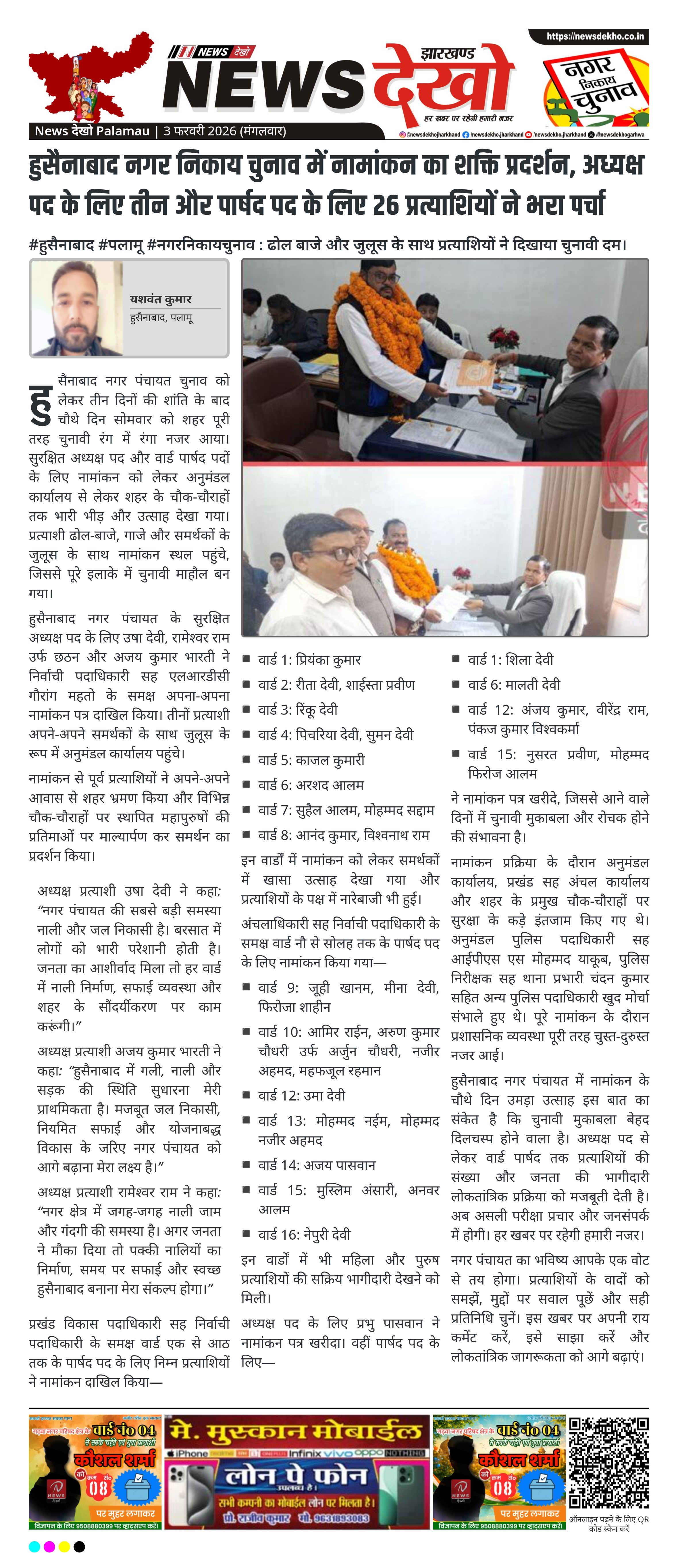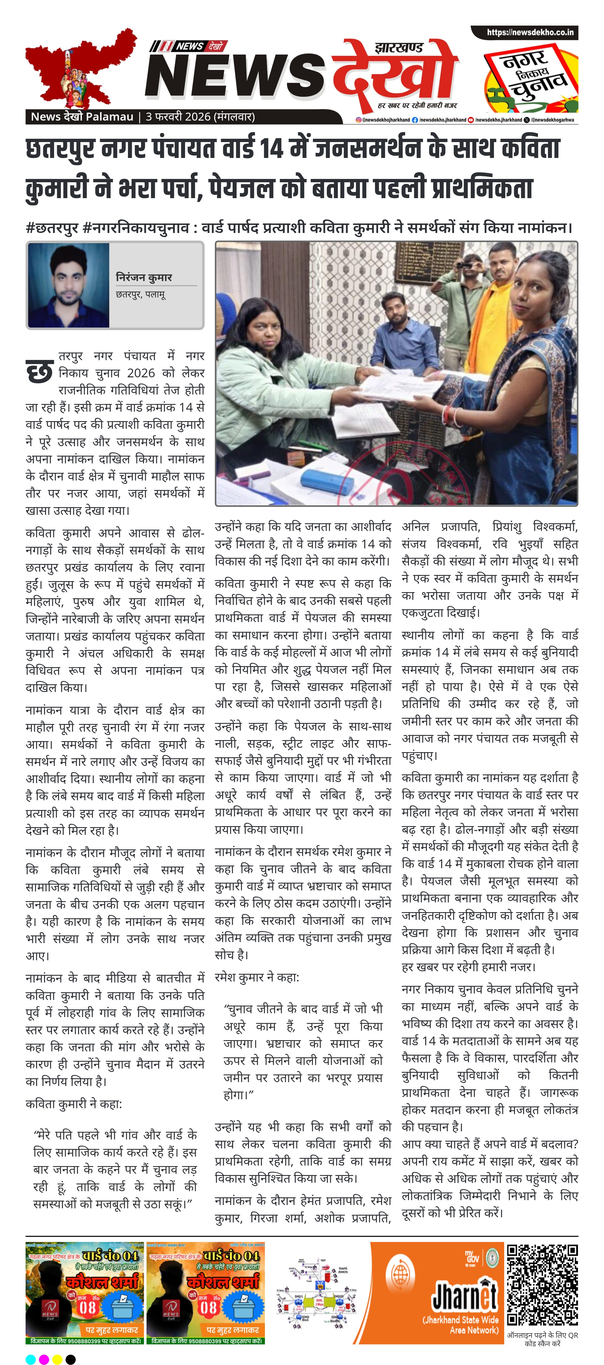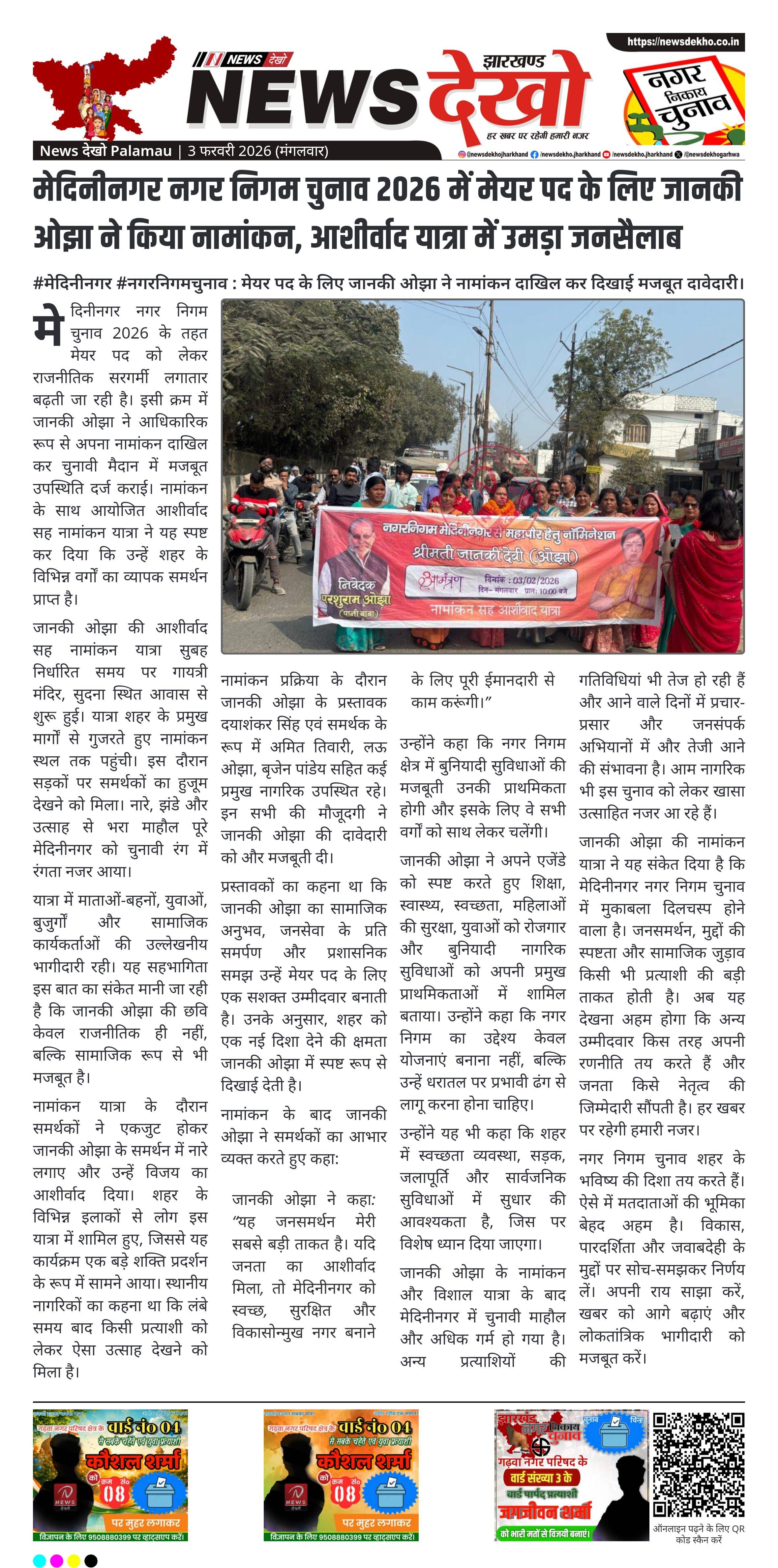 #मेदिनीनगर #विश्रामपुर #नगरपरिषदचुनाव : नामांकन के दौरान उमड़ा जनसैलाब, हजारों समर्थकों के साथ पहुंचीं प्रत्याशी। विश्रामपुर नगर परिषद अध्यक्ष पद की प्रत्याशी हैं रचना कुमारी शुक्ला। नामांकन से पूर्व मंदिर में पूजा-पाठ कर निकाला भव्य जुलूस। हजारों महिला-पुरुष व युवाओं की रही मौजूदगी। शिक्षा, पेयजल, स्वास्थ्य और स्वच्छता को बताया…