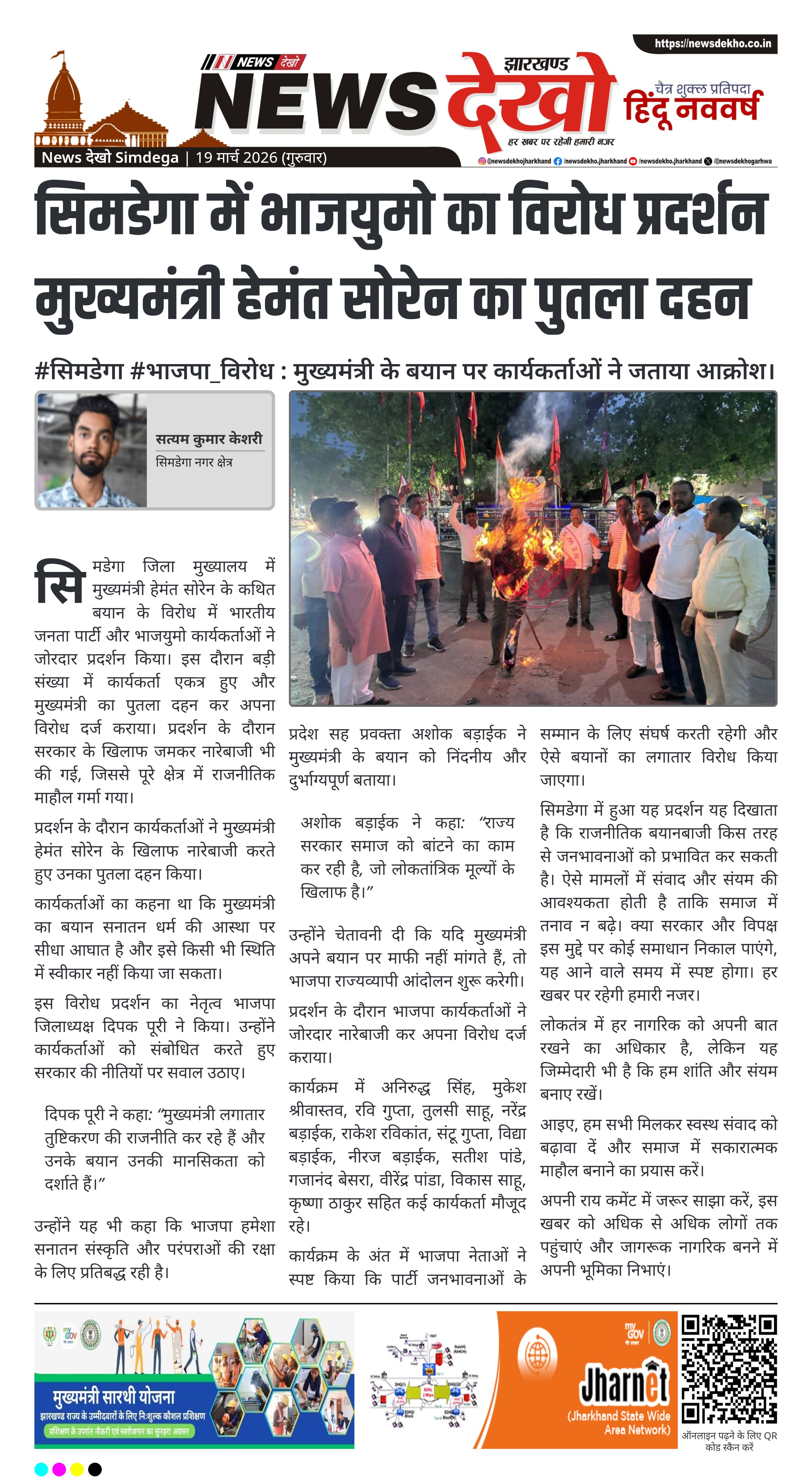 सिमडेगा में भाजयुमो का विरोध प्रदर्शन मुख्यमंत्री हेमंत सोरेन का पुतला दहन