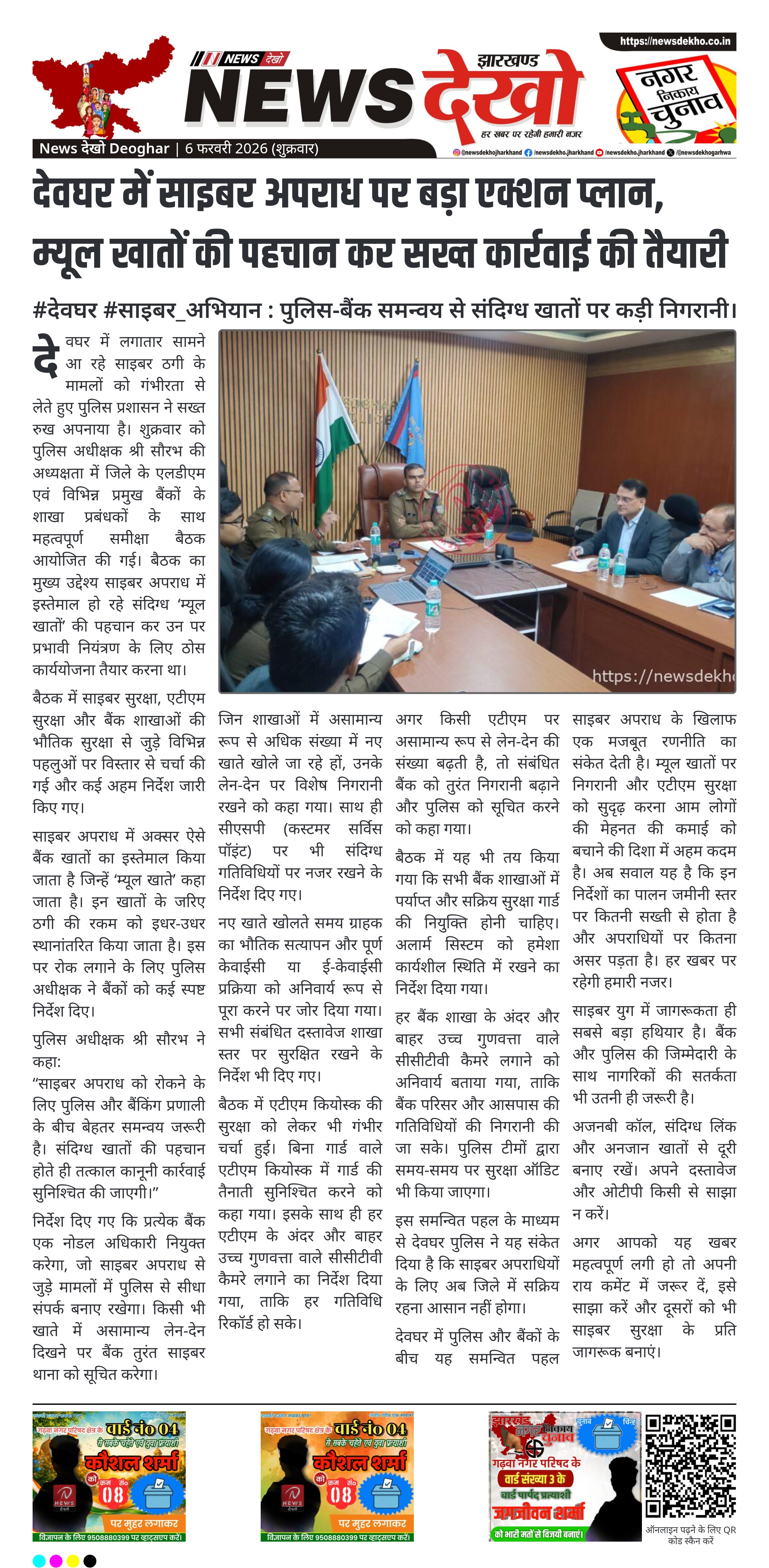 #देवघर #साइबर_अभियान : पुलिस-बैंक समन्वय से संदिग्ध खातों पर कड़ी निगरानी। पुलिस अधीक्षक श्री सौरभ की अध्यक्षता में समीक्षा बैठक आयोजित। संदिग्ध म्यूल खातों की पहचान कर कड़ी कार्रवाई की तैयारी। प्रत्येक बैंक को नोडल अधिकारी नियुक्त करने का निर्देश। एटीएम कियोस्क में गार्ड और सीसीटीवी अनिवार्य करने की बात।…