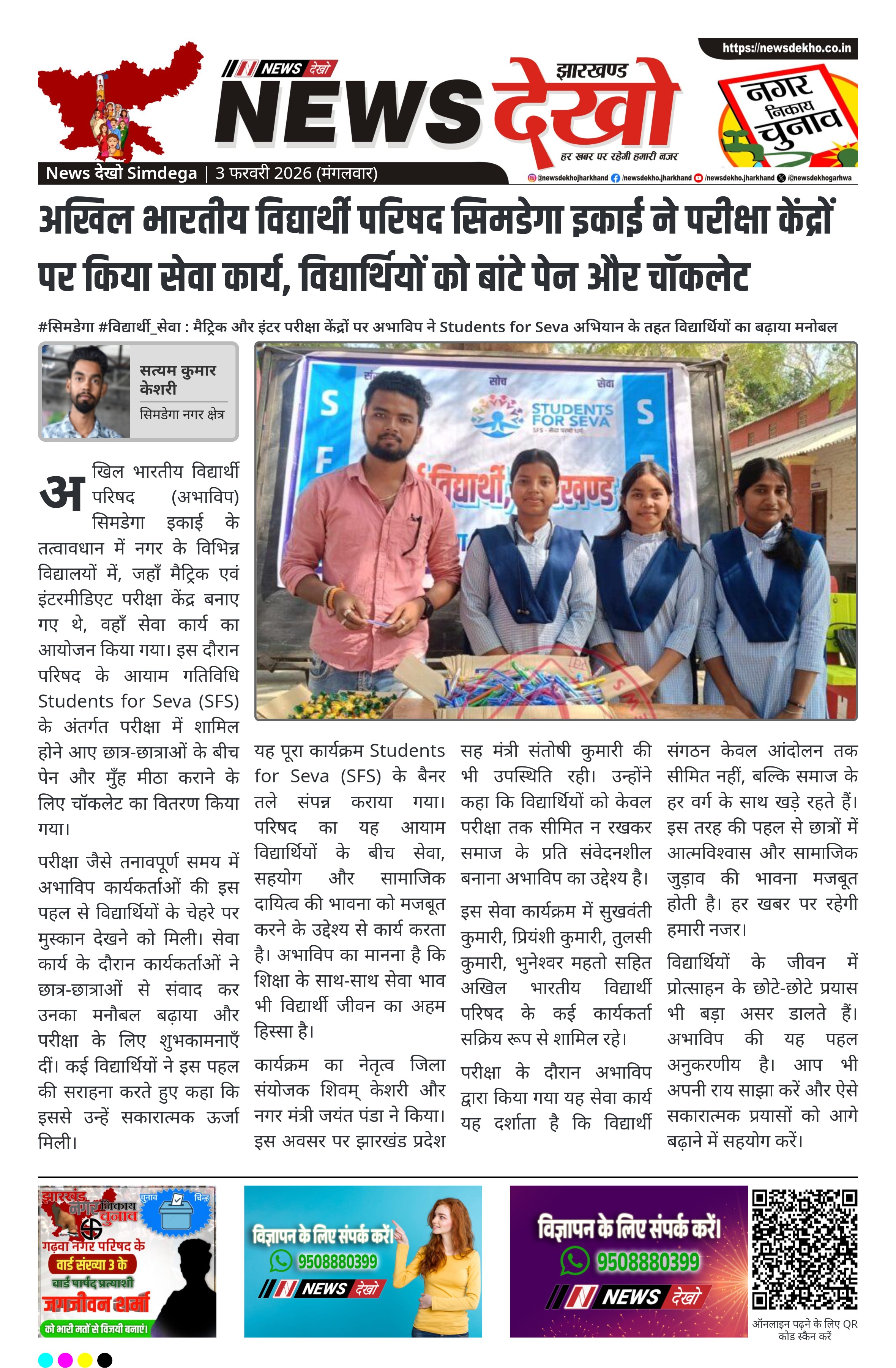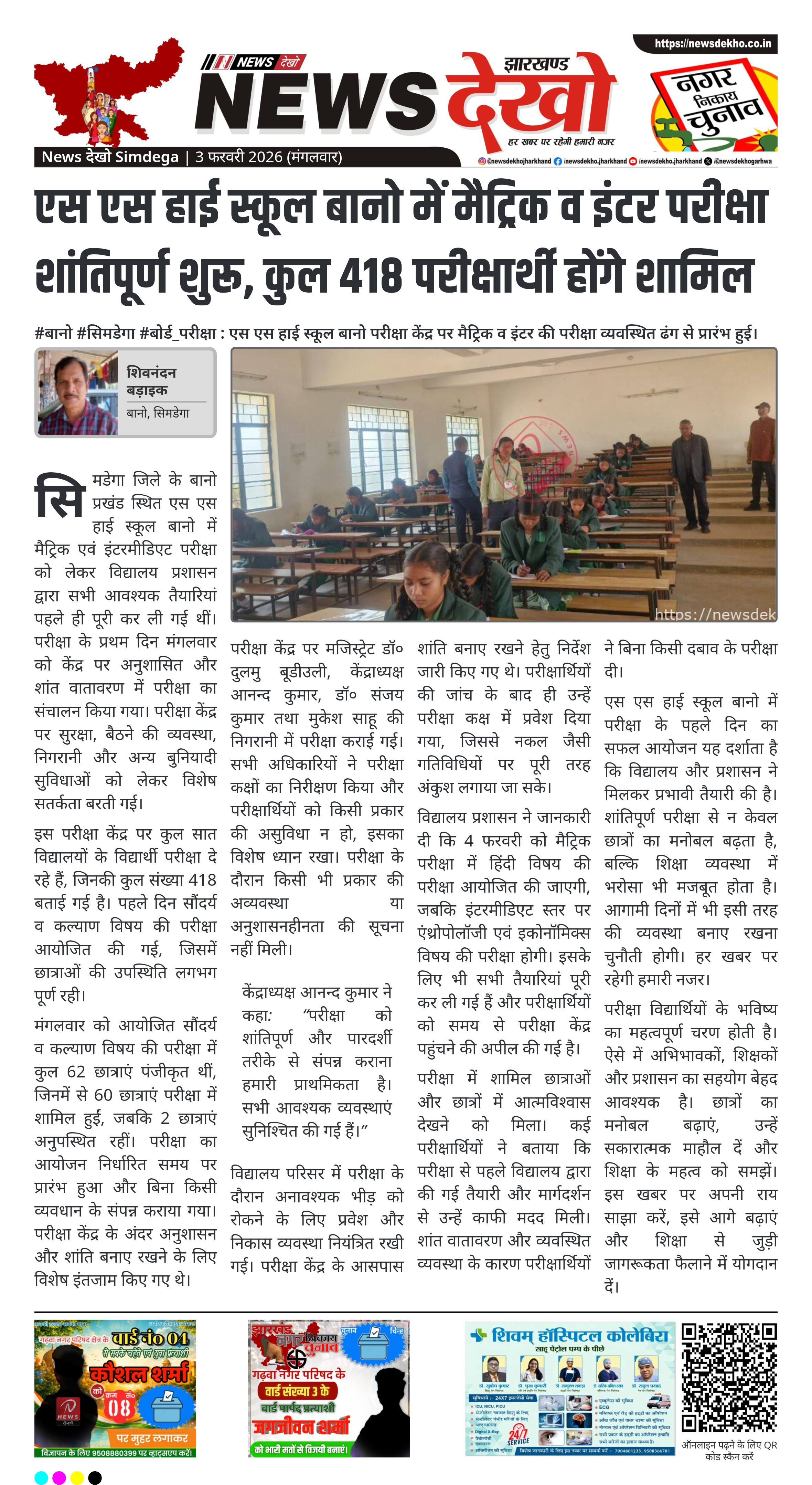 #पांडू #मैट्रिक_परीक्षा : हिंदी ए और हिंदी बी विषय की परीक्षा में 433 परीक्षार्थी हुए शामिल। 04 फरवरी 2026 को आयोजित हुई मैट्रिक हिंदी ए और हिंदी बी की परीक्षा। कुल परीक्षार्थी 435, जिनमें 433 उपस्थित और 2 अनुपस्थित रहे। परीक्षा केंद्र रहा राजकीयकृत प्लस टू कल्याण उच्च विद्यालय, पांडू।…