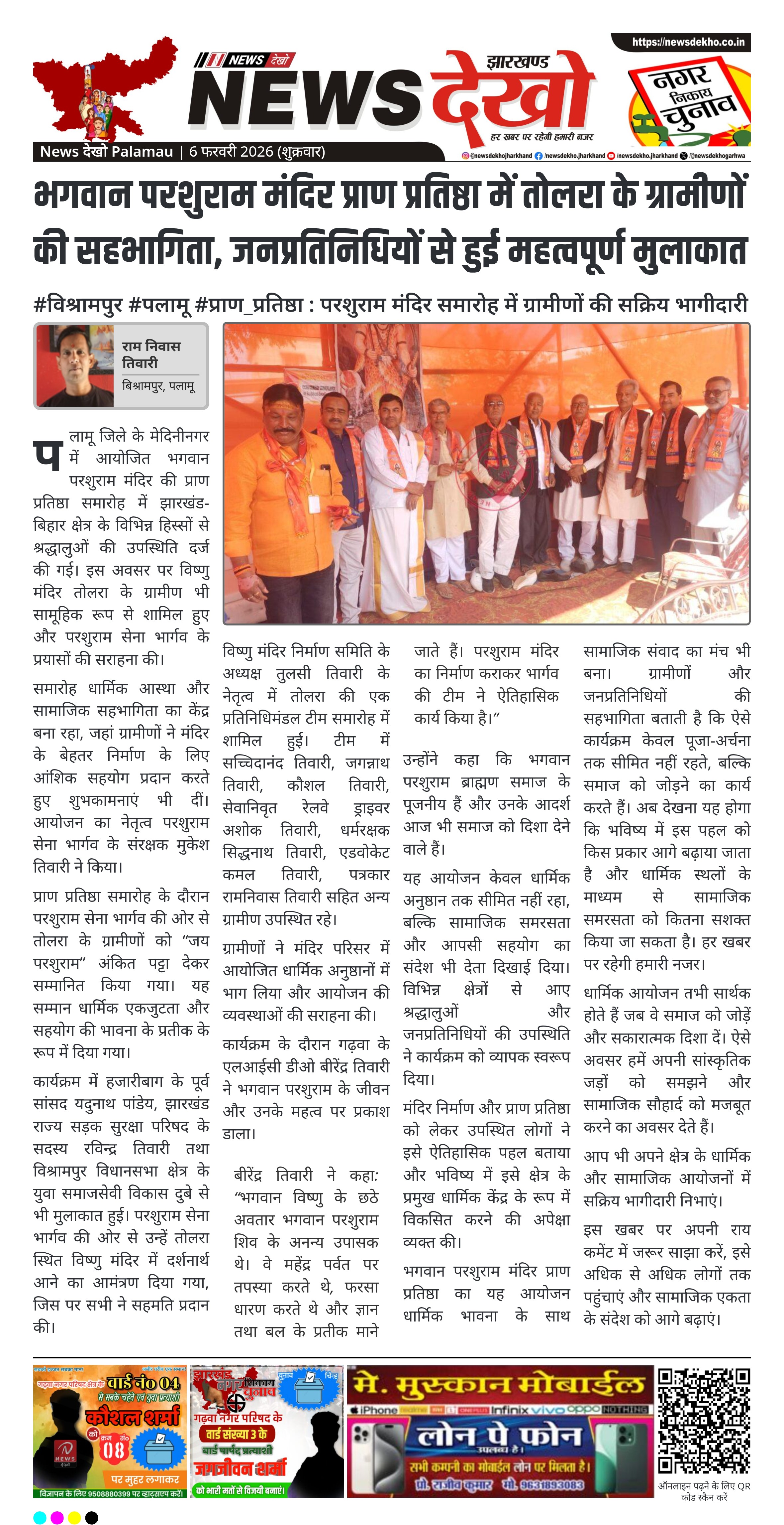 #विश्रामपुर #पलामू #प्राण_प्रतिष्ठा : परशुराम मंदिर समारोह में ग्रामीणों की सक्रिय भागीदारी। विष्णु मंदिर तोलरा के ग्रामीणों ने प्राण प्रतिष्ठा में भाग लिया। परशुराम सेना भार्गव ने जय परशुराम पट्टा देकर सम्मानित किया। पूर्व सांसद यदुनाथ पांडेय सहित अन्य जनप्रतिनिधियों से मुलाकात। ग्रामीणों ने मंदिर निर्माण कार्य की सराहना की।…