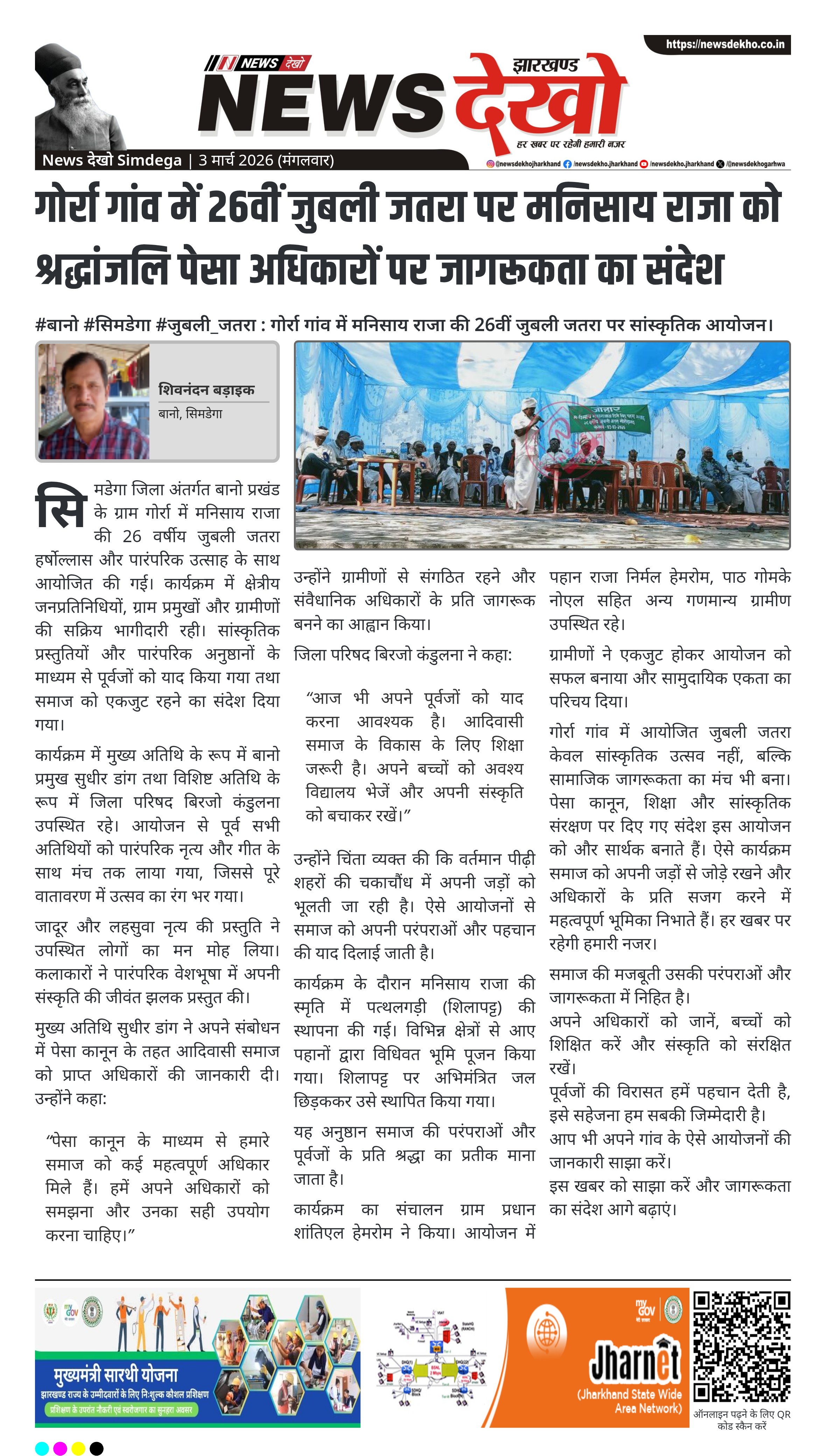 #सिमडेगा #नगरपालिका_चुनाव_2026 : उपायुक्त और एसपी ने मतदान केंद्रों का निरीक्षण कर मूलभूत सुविधाएं सुनिश्चित करने दिए निर्देश। सिमडेगा कॉलेज में बनाए गए मतगणना केंद्र व स्ट्रांग रूम का निरीक्षण। वार्ड 07, 11 और 12 के मतदान केंद्रों का लिया गया जायजा। रैंप निर्माण व विद्युत व्यवस्था दुरुस्त करने का…