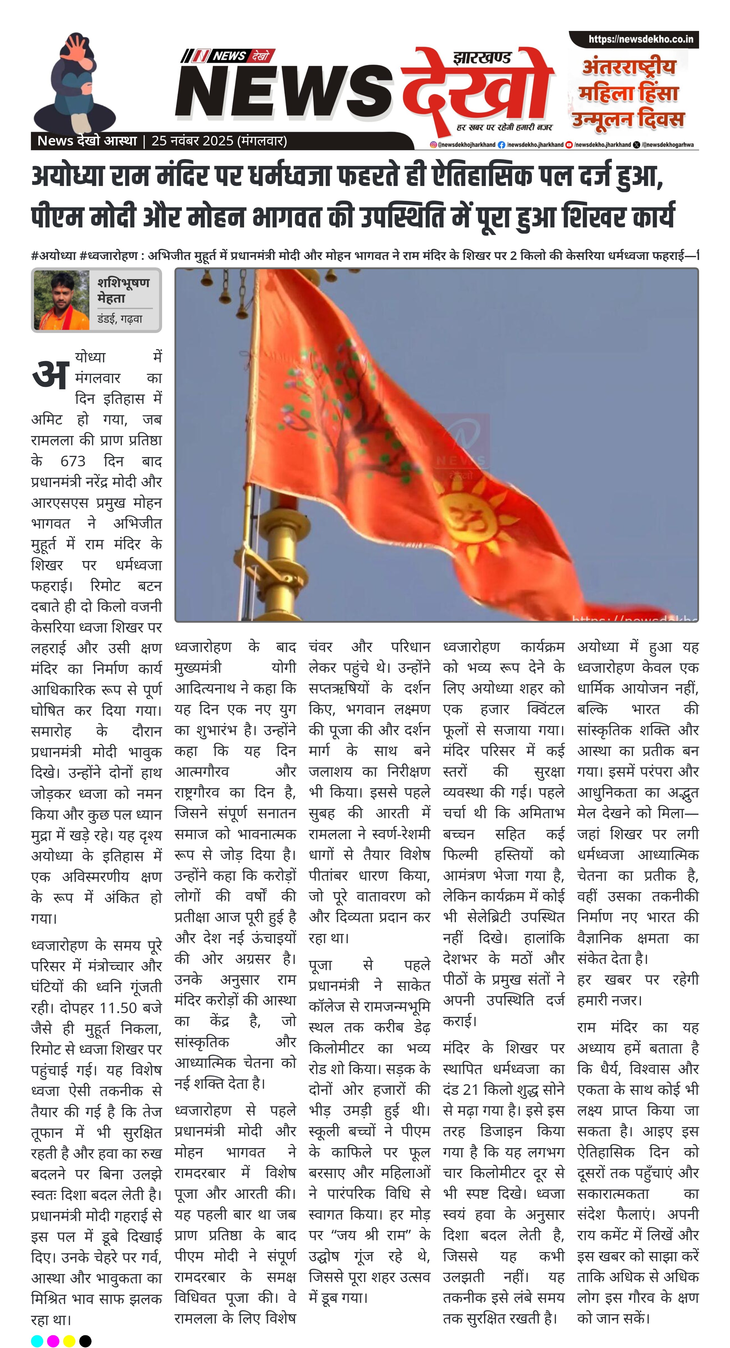 #अयोध्या #ध्वजारोहण : अभिजीत मुहूर्त में प्रधानमंत्री मोदी और मोहन भागवत ने राम मंदिर के शिखर पर 2 किलो की केसरिया धर्मध्वजा फहराई—निर्माण कार्य हुआ औपचारिक रूप से पूर्ण शिखर पर धर्मध्वजा फहराते ही मंदिर निर्माण कार्य पूर्ण घोषित। पीएम मोदी और मोहन भागवत ने रिमोट से ध्वजारोहण किया। सीएम…