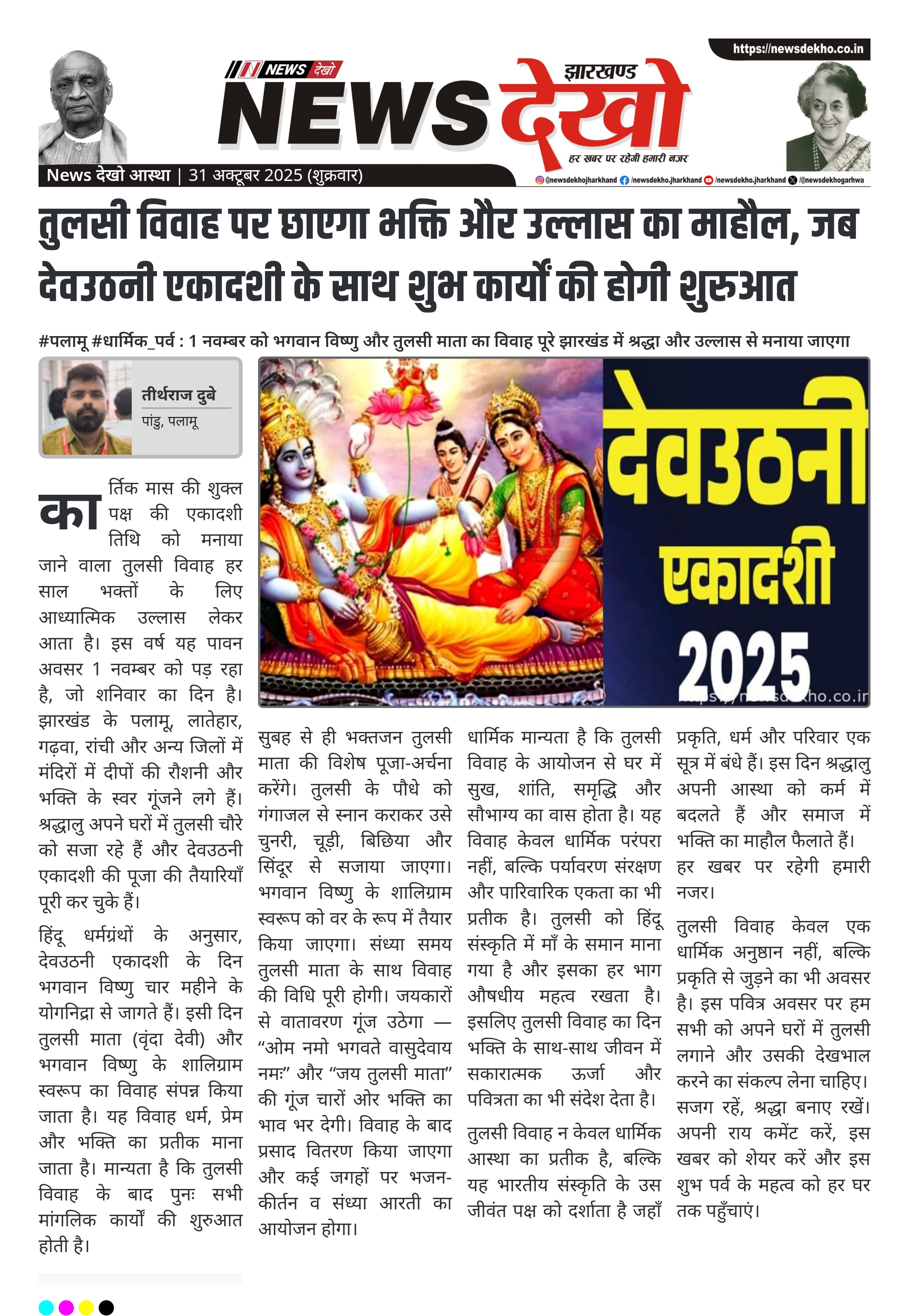 #पलामू #धार्मिक_पर्व : 1 नवम्बर को भगवान विष्णु और तुलसी माता का विवाह पूरे झारखंड में श्रद्धा और उल्लास से मनाया जाएगा 1 नवम्बर 2025 (शनिवार) को पूरे देश में तुलसी विवाह का पावन पर्व श्रद्धा और भक्ति के साथ मनाया जाएगा। यह पर्व देवउठनी एकादशी के दिन मनाया जाता…