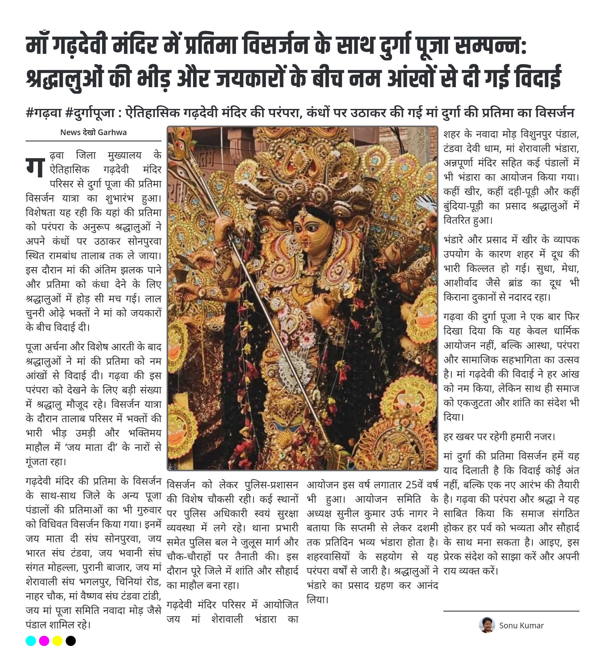 #गढ़वा #दुर्गापूजा : ऐतिहासिक गढ़देवी मंदिर की परंपरा, कंधों पर उठाकर की गई मां दुर्गा की प्रतिमा का विसर्जन गढ़देवी मंदिर की प्रतिमा को श्रद्धालुओं ने कंधे पर उठाकर किया विसर्जन। सोनपुरवा तालाब में उमड़ी भारी भीड़, नम आंखों से दी गई मां को विदाई। जिले के अन्य पूजा पंडालों…