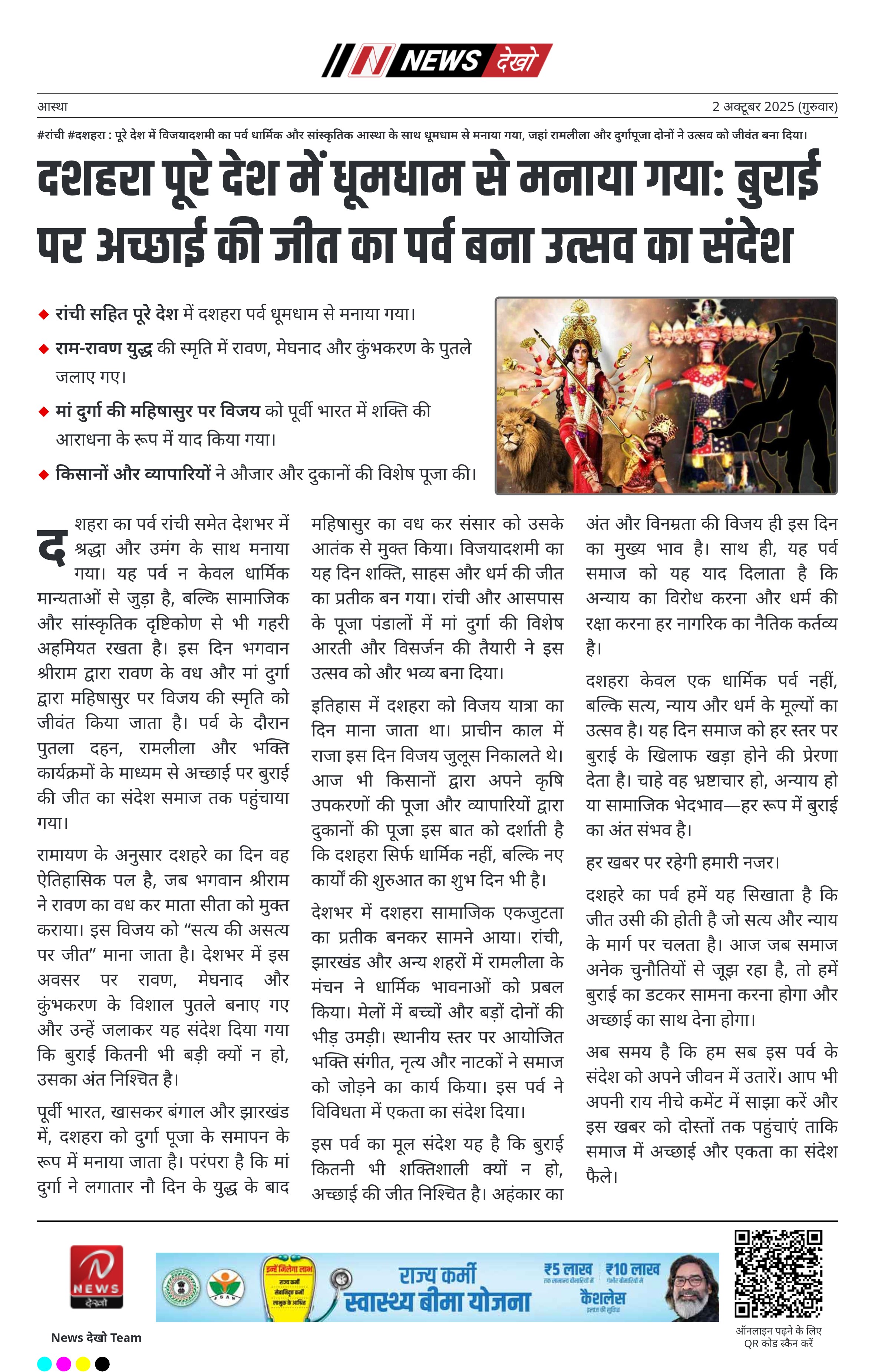 #रांची #दशहरा : पूरे देश में विजयादशमी का पर्व धार्मिक और सांस्कृतिक आस्था के साथ धूमधाम से मनाया गया, जहां रामलीला और दुर्गापूजा दोनों ने उत्सव को जीवंत बना दिया। रांची सहित पूरे देश में दशहरा पर्व धूमधाम से मनाया गया। राम-रावण युद्ध की स्मृति में रावण, मेघनाद और कुंभकरण…