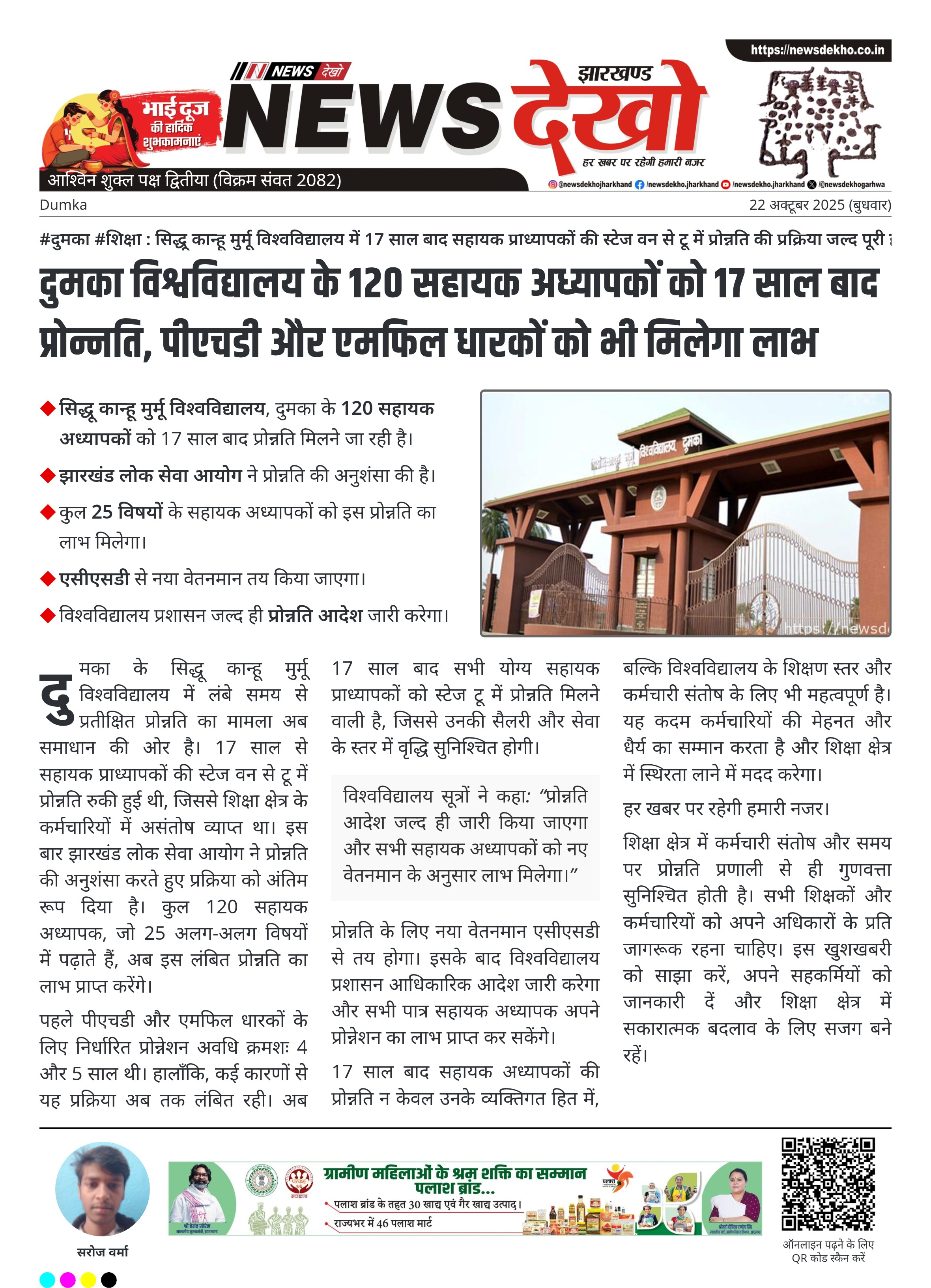 - सिद्धू कान्हू मुर्मू विश्वविद्यालय, दुमका के 120 सहायक अध्यापकों को 17 साल बाद प्रोन्नति मिलने जा रही है।