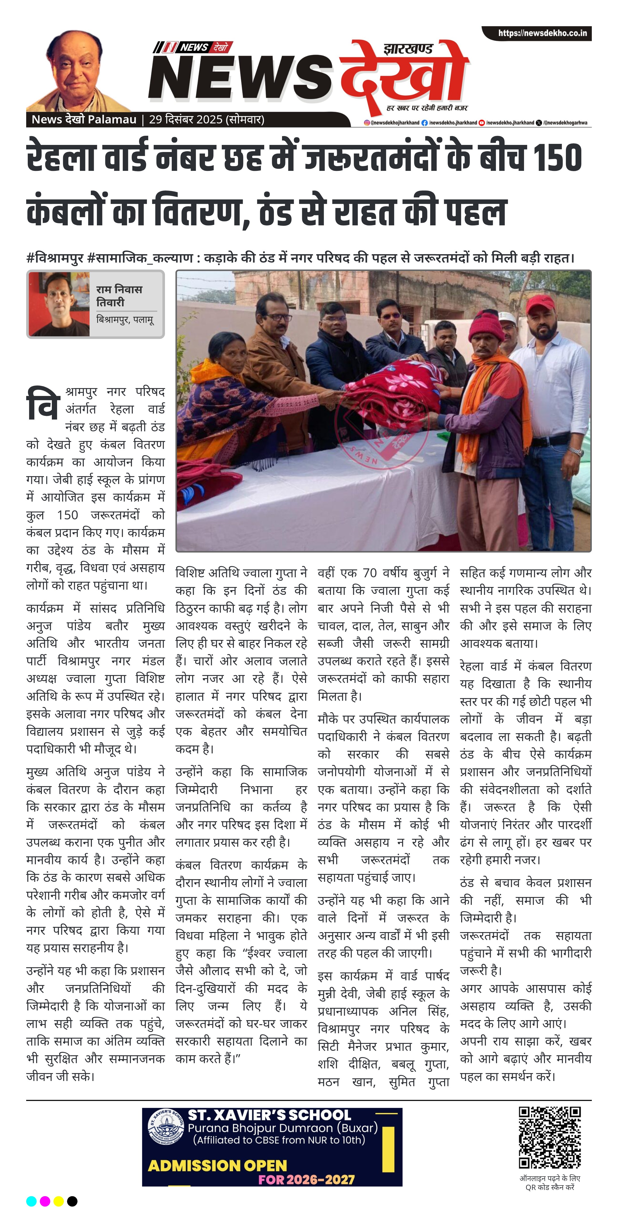 विश्रामपुर नगर परिषद अंतर्गत रेहला वार्ड नंबर छह में बढ़ती ठंड को देखते हुए कंबल वितरण कार्यक्रम का आयोजन किया गया। जेबी हाई स्कूल के प्रांगण में आयोजित इस कार्यक्रम में कुल 150 जरूरतमंदों को कंबल प्रदान किए गए। कार्यक्रम का उद्देश्य ठंड के मौसम में गरीब, वृद्ध, विधवा एवं असहाय लोगों को राहत पहुंचाना था।