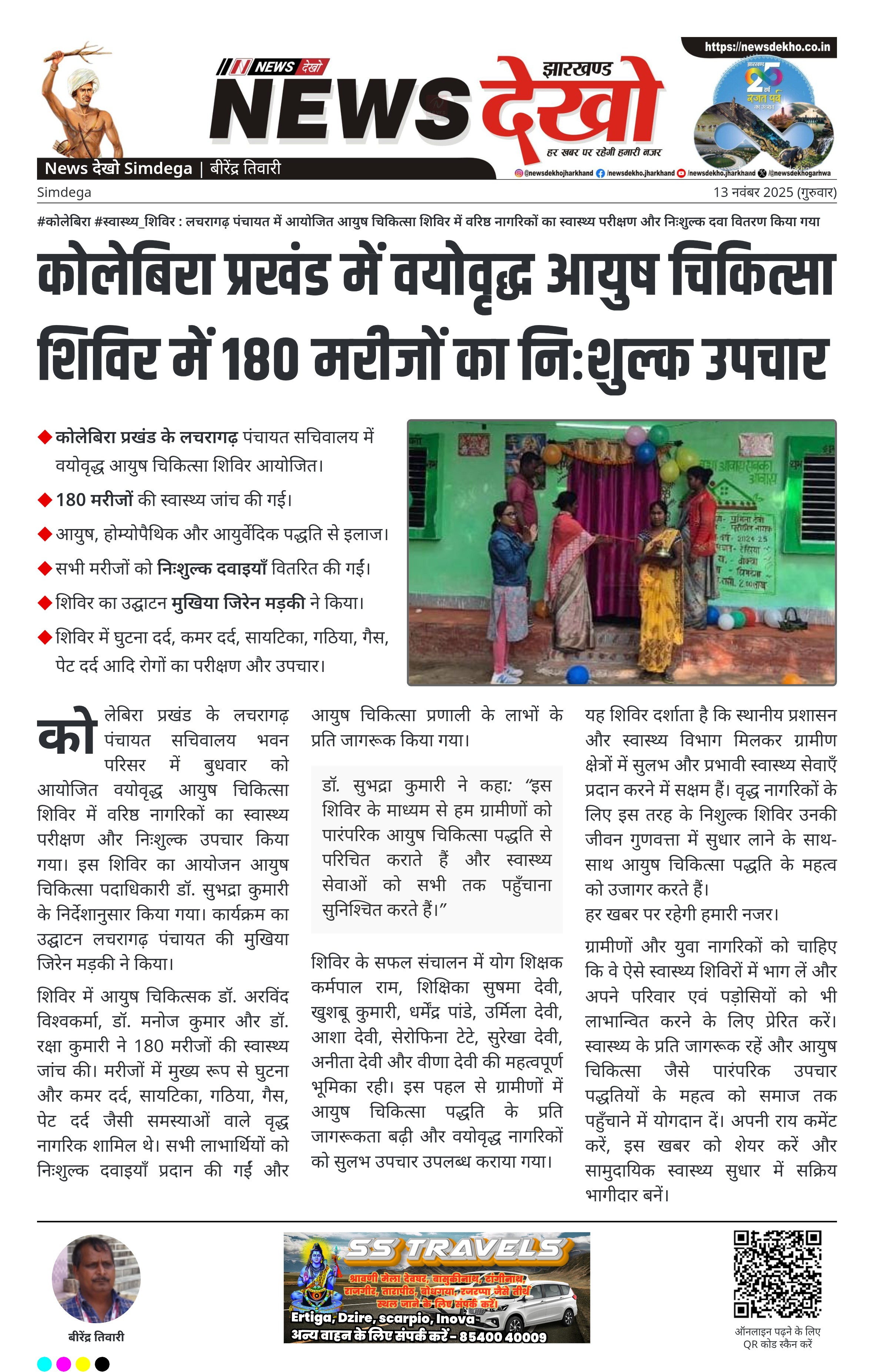 - कोलेबिरा प्रखंड के लचरागढ़ पंचायत सचिवालय में वयोवृद्ध आयुष चिकित्सा शिविर आयोजित।