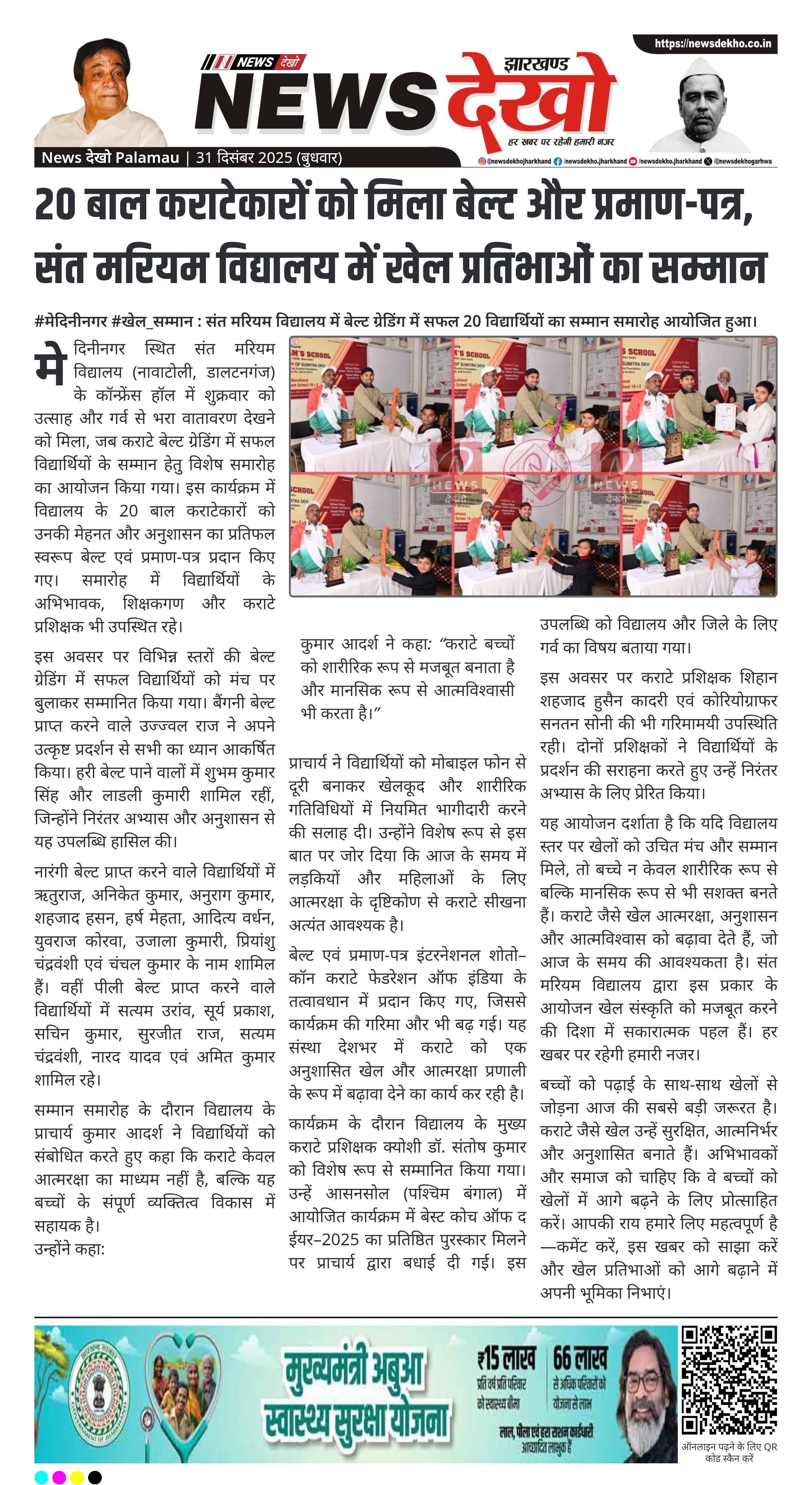 #मेदिनीनगर #खेल_सम्मान : संत मरियम विद्यालय में बेल्ट ग्रेडिंग में सफल 20 विद्यार्थियों का सम्मान समारोह आयोजित हुआ।