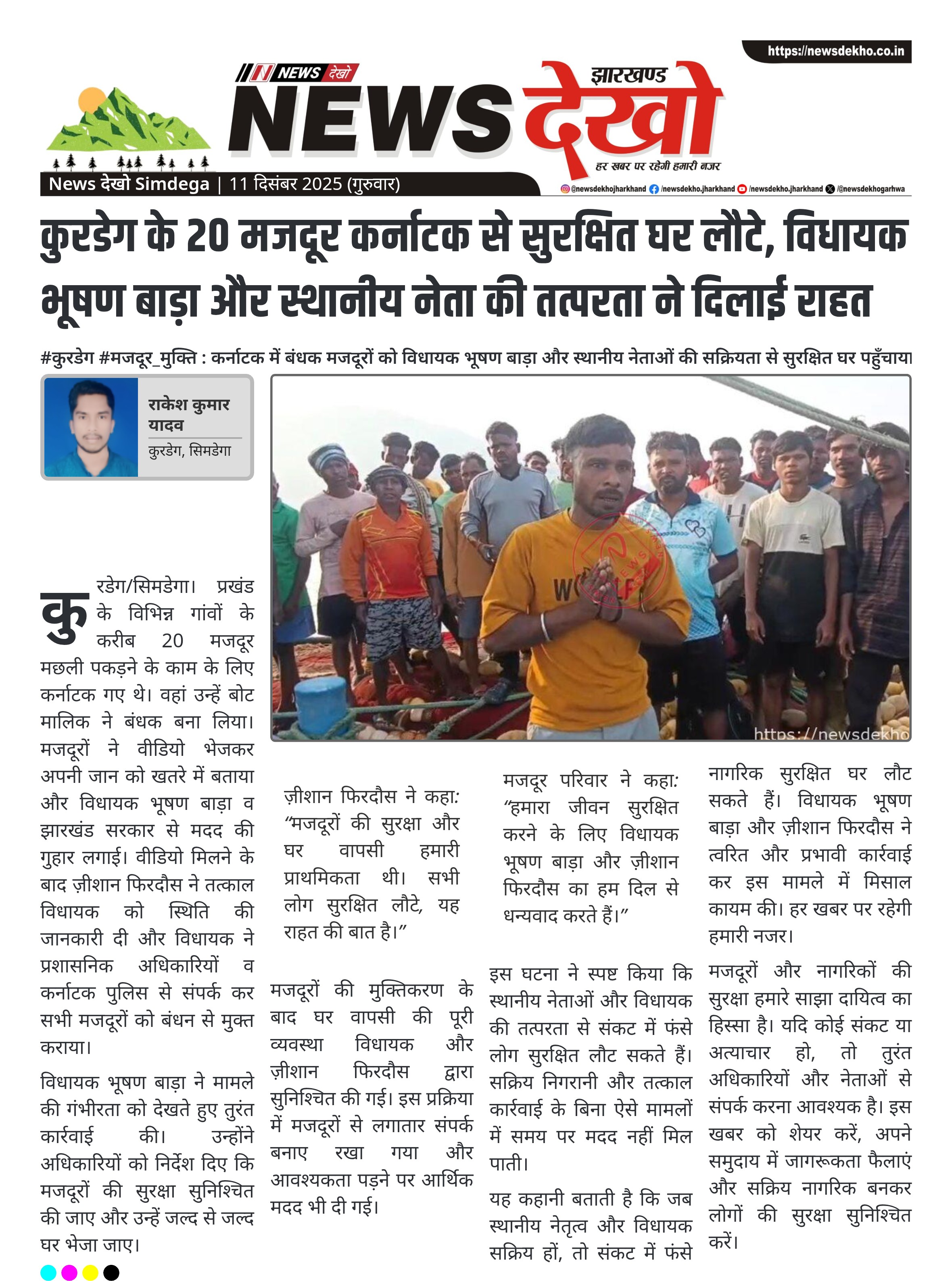 कुरडेग/सिमडेगा। प्रखंड के विभिन्न गांवों के करीब 20 मजदूर मछली पकड़ने के काम के लिए कर्नाटक गए थे। वहां उन्हें बोट मालिक ने बंधक बना लिया। मजदूरों ने वीडियो भेजकर अपनी जान को खतरे में बताया और विधायक भूषण बाड़ा व झारखंड सरकार से मदद की गुहार लगाई। वीडियो मिलने के बाद ज़ीशान फिरदौस ने तत्काल विधायक को स्थिति की जानकारी दी और विधायक ने प्रशासनिक अधिकारियों व कर्नाटक पुलिस से संपर्क कर सभी मजदूरों को बंधन से मुक्त कराया।