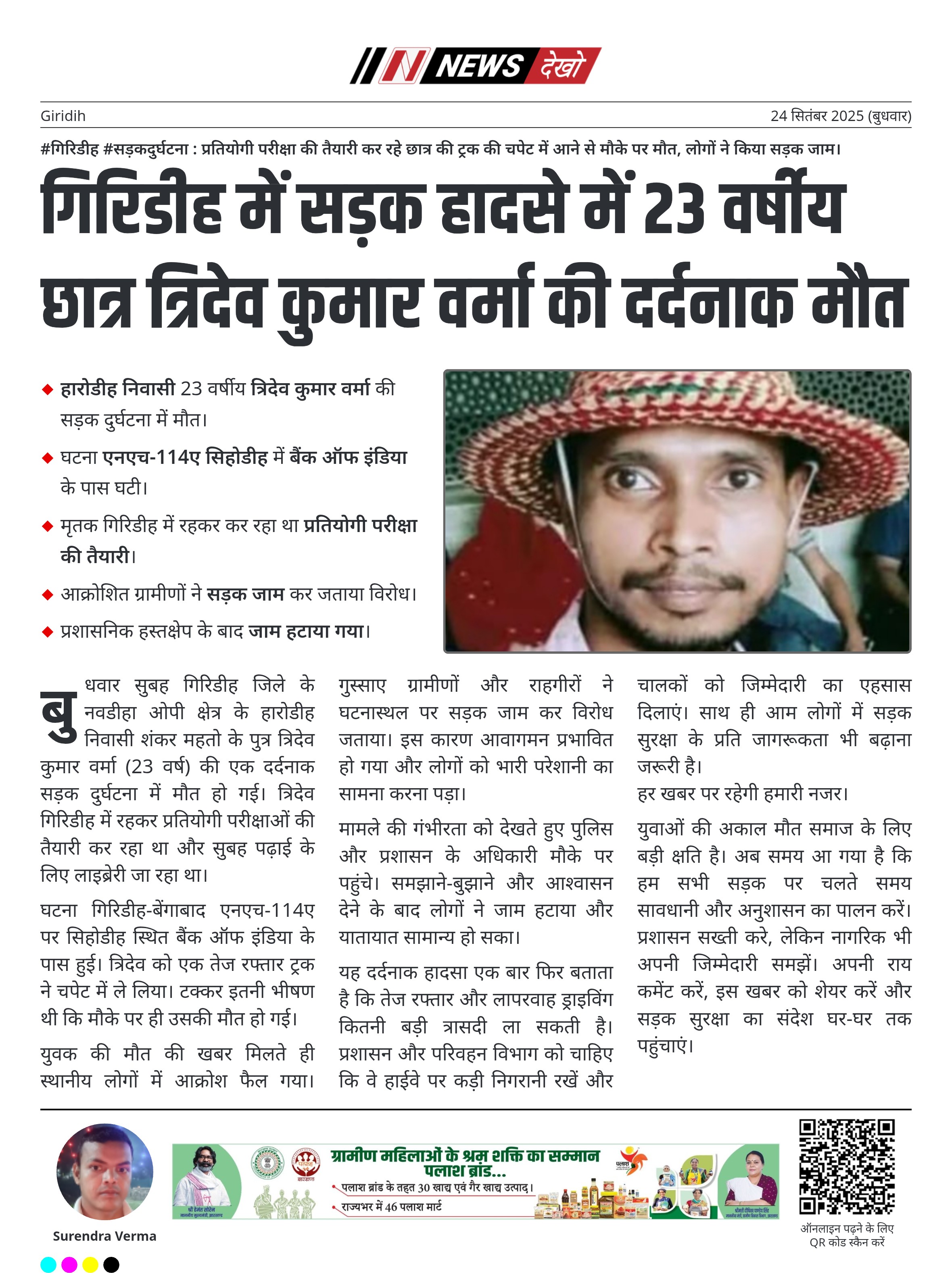 - हारोडीह निवासी 23 वर्षीय त्रिदेव कुमार वर्मा की सड़क दुर्घटना में मौत।