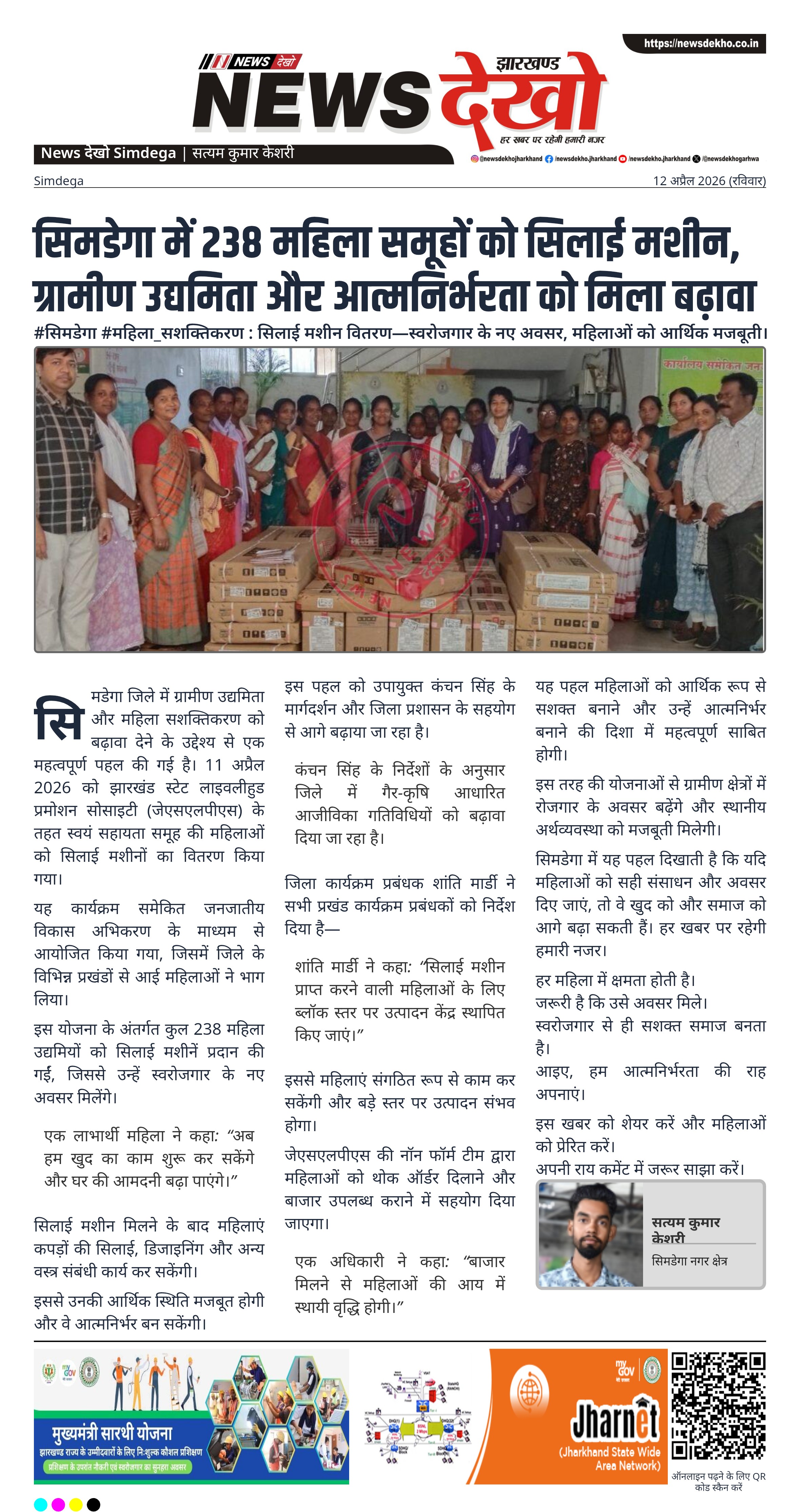 सिमडेगा जिले में ग्रामीण उद्यमिता और महिला सशक्तिकरण को बढ़ावा देने के उद्देश्य से एक महत्वपूर्ण पहल की गई है। 11 अप्रैल 2026 को झारखंड स्टेट लाइवलीहुड प्रमोशन सोसाइटी (जेएसएलपीएस) के तहत स्वयं सहायता समूह की महिलाओं को सिलाई मशीनों का वितरण किया गया।
