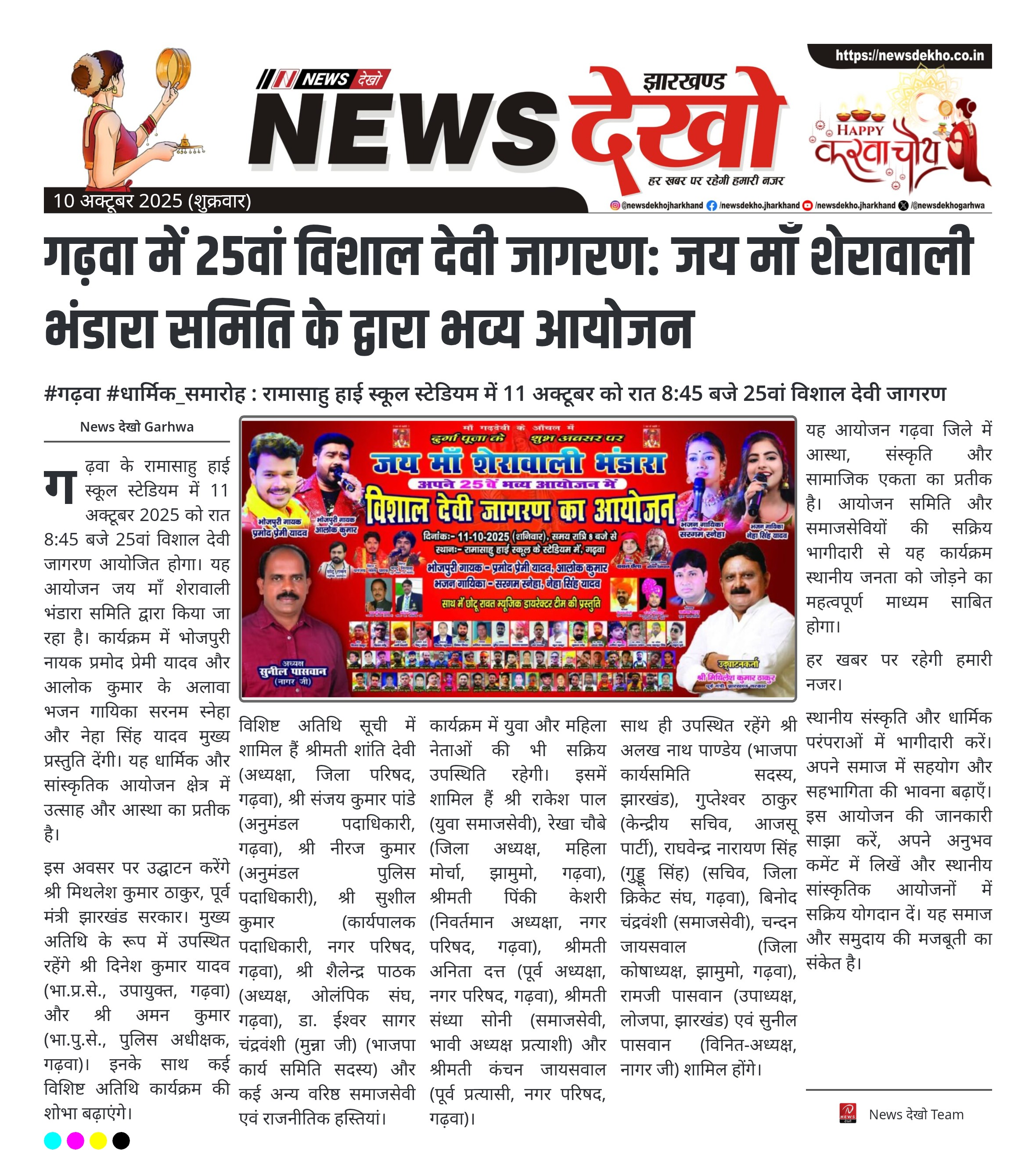 गढ़वा के रामासाहु हाई स्कूल स्टेडियम में 11 अक्टूबर 2025 को रात 8:45 बजे 25वां विशाल देवी जागरण आयोजित होगा। यह आयोजन जय माँ शेरावाली भंडारा समिति द्वारा किया जा रहा है। कार्यक्रम में भोजपुरी नायक प्रमोद प्रेमी यादव और आलोक कुमार के अलावा भजन गायिका सरनम स्नेहा और नेहा सिंह यादव मुख्य प्रस्तुति देंगी। यह धार्मिक और सांस्कृतिक आयोजन क्षेत्र में उत्साह और आस्था का प्रतीक है।