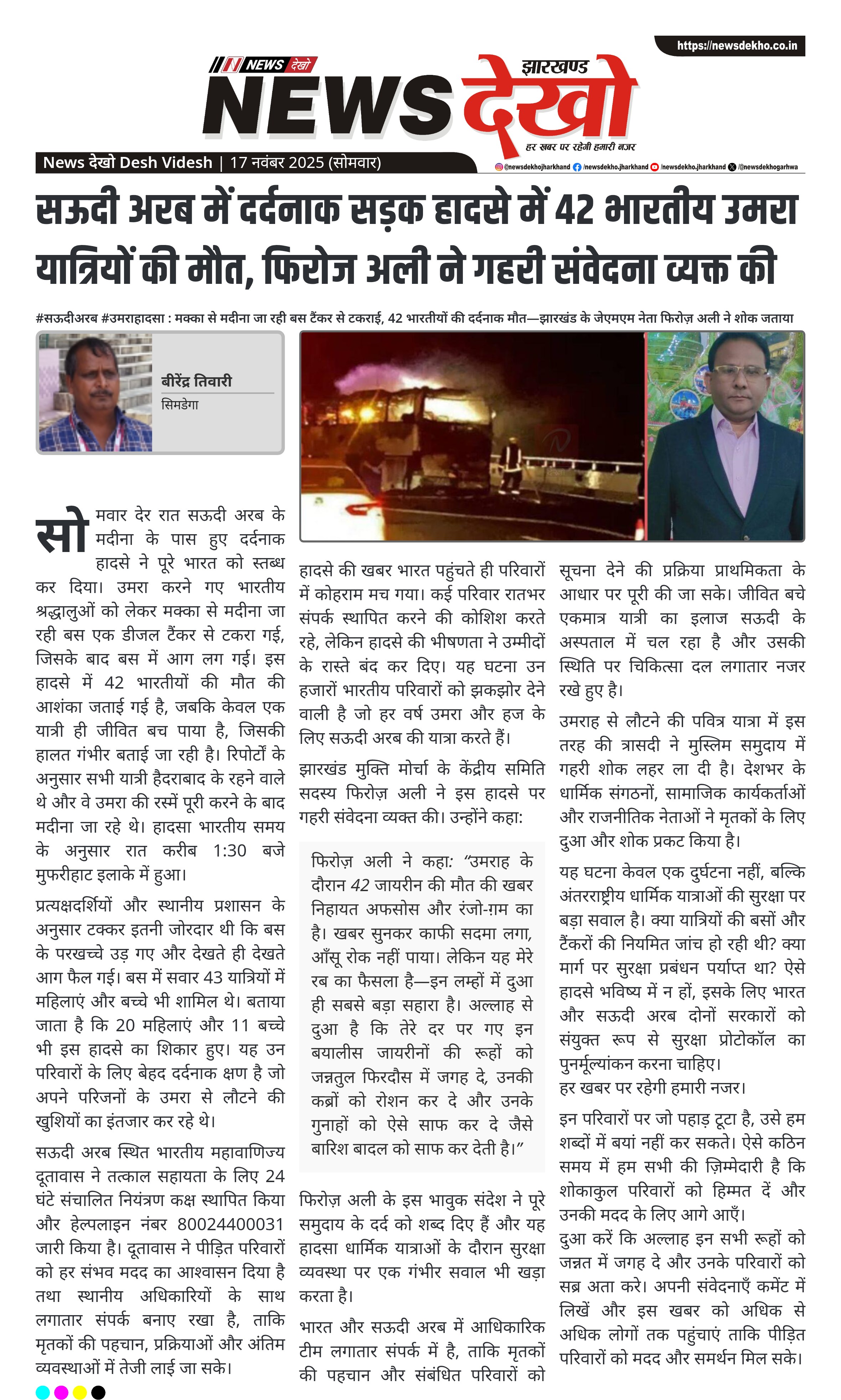 #सऊदीअरब #उमराहादसा : मक्का से मदीना जा रही बस टैंकर से टकराई, 42 भारतीयों की दर्दनाक मौत—झारखंड के जेएमएम नेता फिरोज़ अली ने शोक जताया