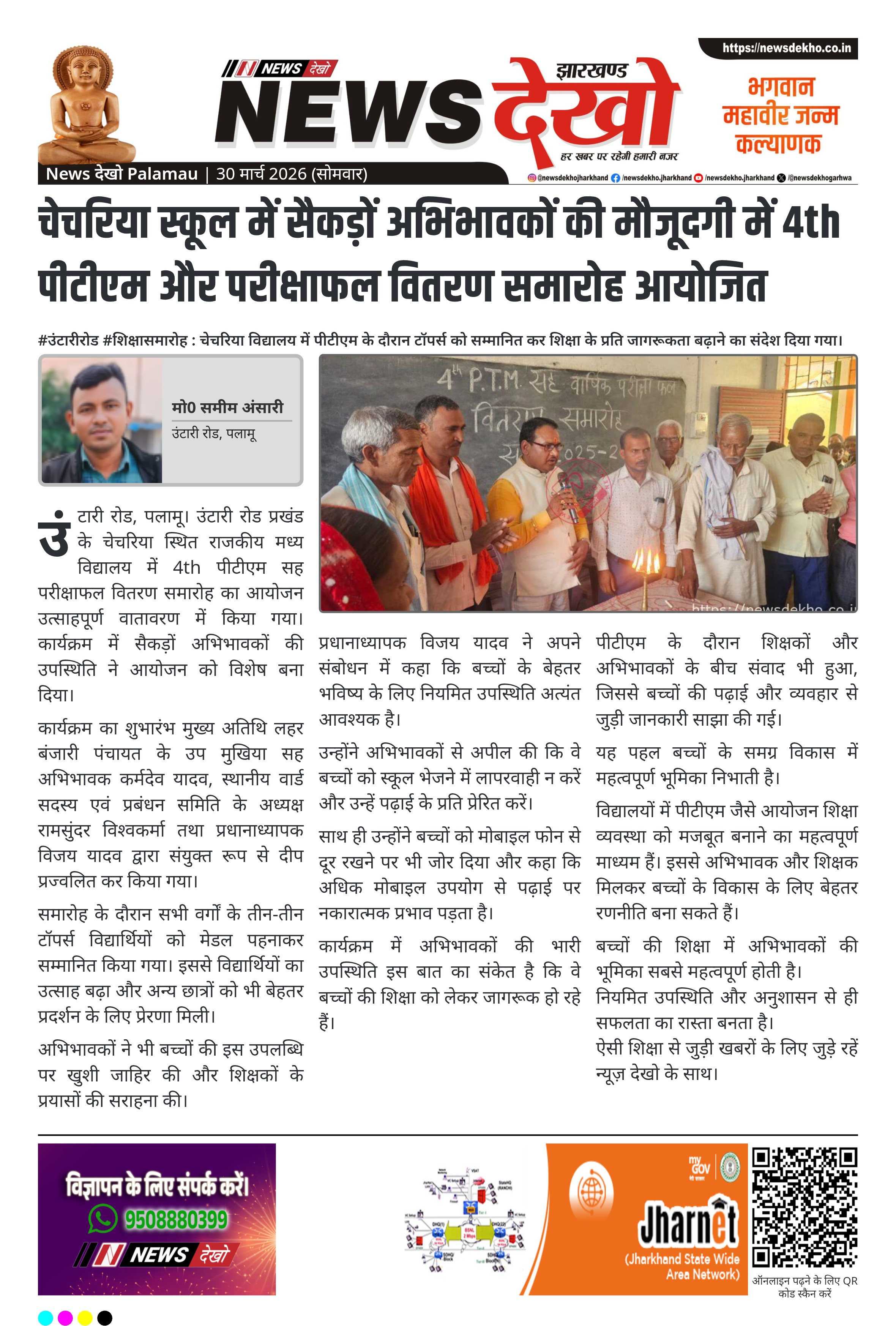पलामू जिले के उंटारी रोड प्रखंड अंतर्गत राजकीय मध्य विद्यालय चेचरिया में 4th पीटीएम सह परीक्षाफल वितरण समारोह का आयोजन किया गया। कार्यक्रम में सैकड़ों अभिभावकों की उपस्थिति रही और मेधावी छात्रों को सम्मानित किया गया। शिक्षकों ने बच्चों की नियमित उपस्थिति और मोबाइल से दूरी बनाए रखने पर जोर दिया।