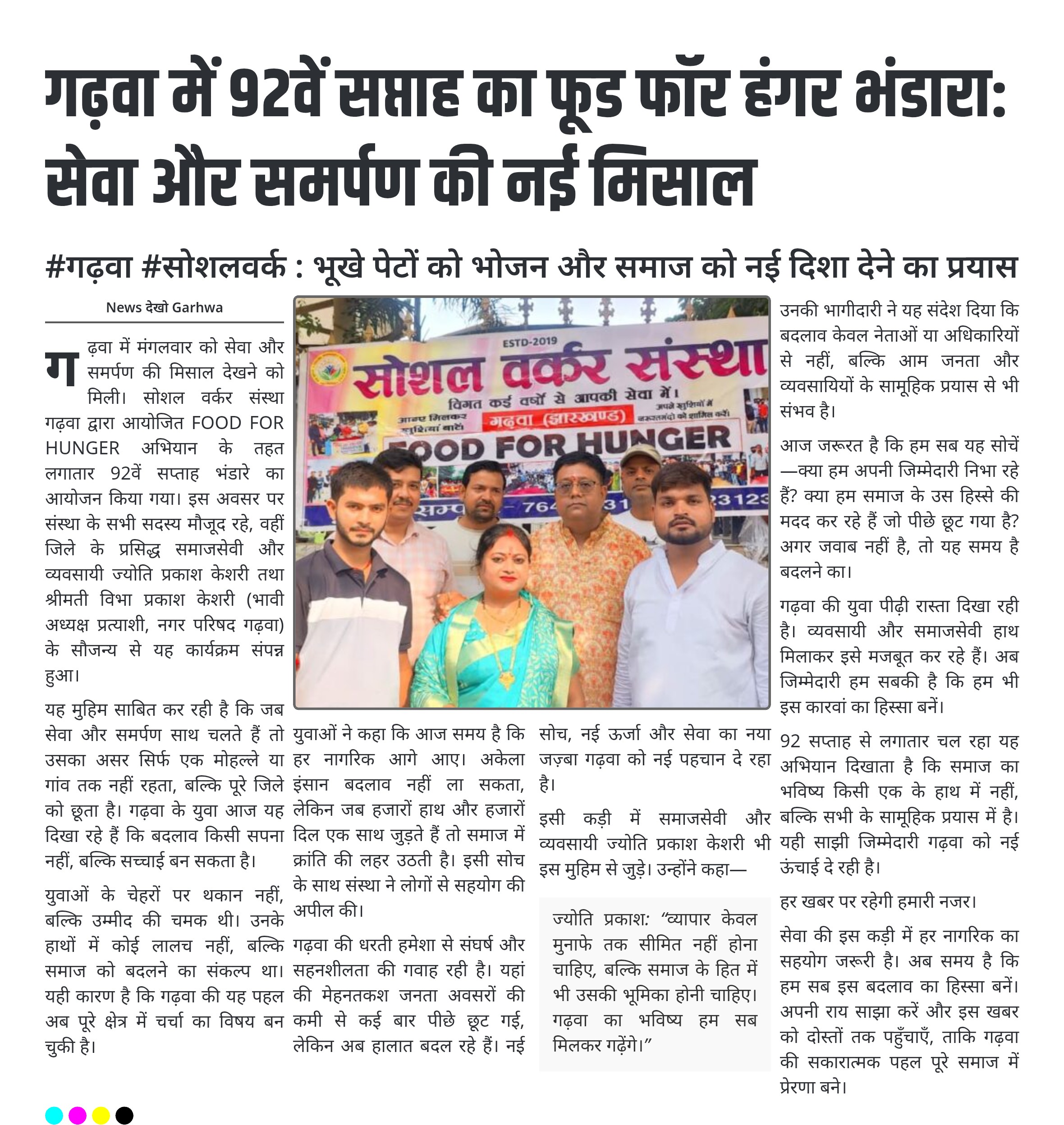 - सोशल वर्कर संस्था गढ़वा ने 92वां FOOD FOR HUNGER भंडारा आयोजित किया।