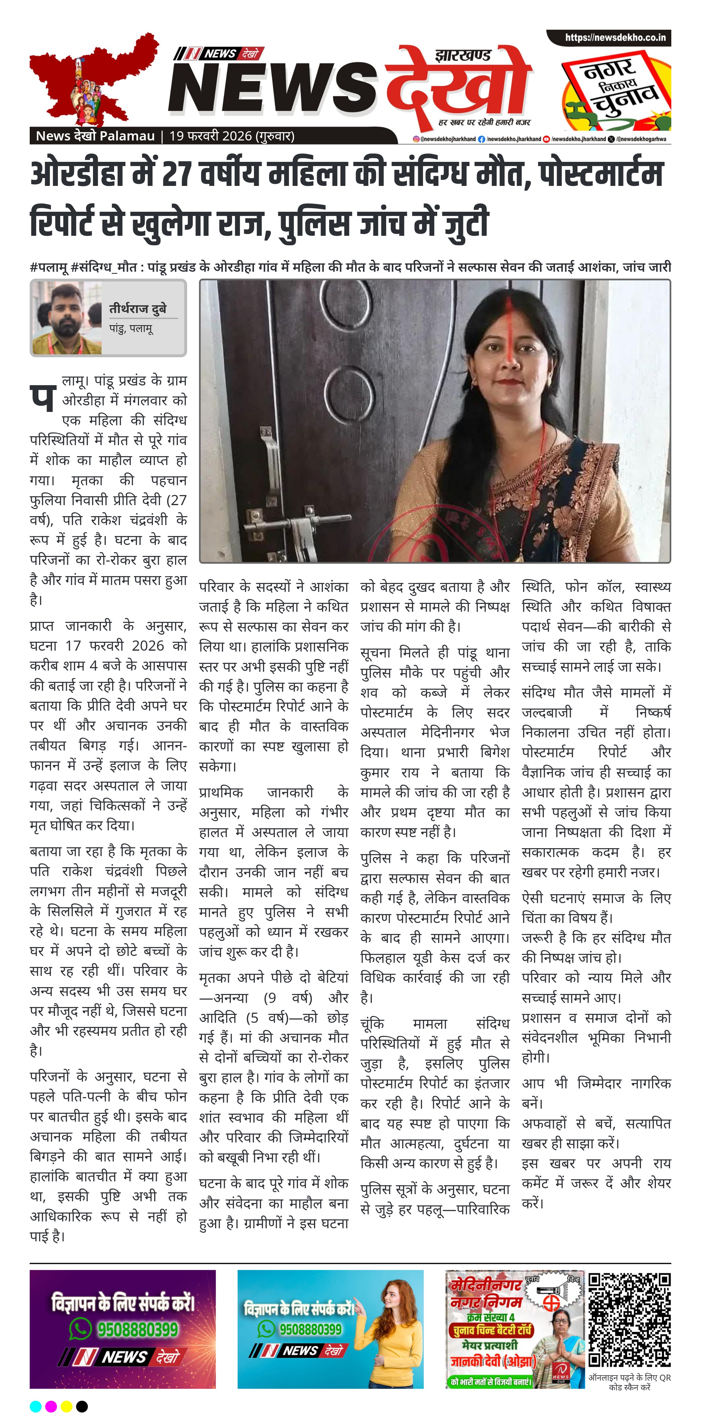 पलामू। पांडू प्रखंड के ग्राम ओरडीहा में मंगलवार को एक महिला की संदिग्ध परिस्थितियों में मौत से पूरे गांव में शोक का माहौल व्याप्त हो गया। मृतका की पहचान फुलिया निवासी प्रीति देवी (27 वर्ष), पति राकेश चंद्रवंशी के रूप में हुई है। घटना के बाद परिजनों का रो-रोकर बुरा हाल है और गांव में मातम पसरा हुआ है।