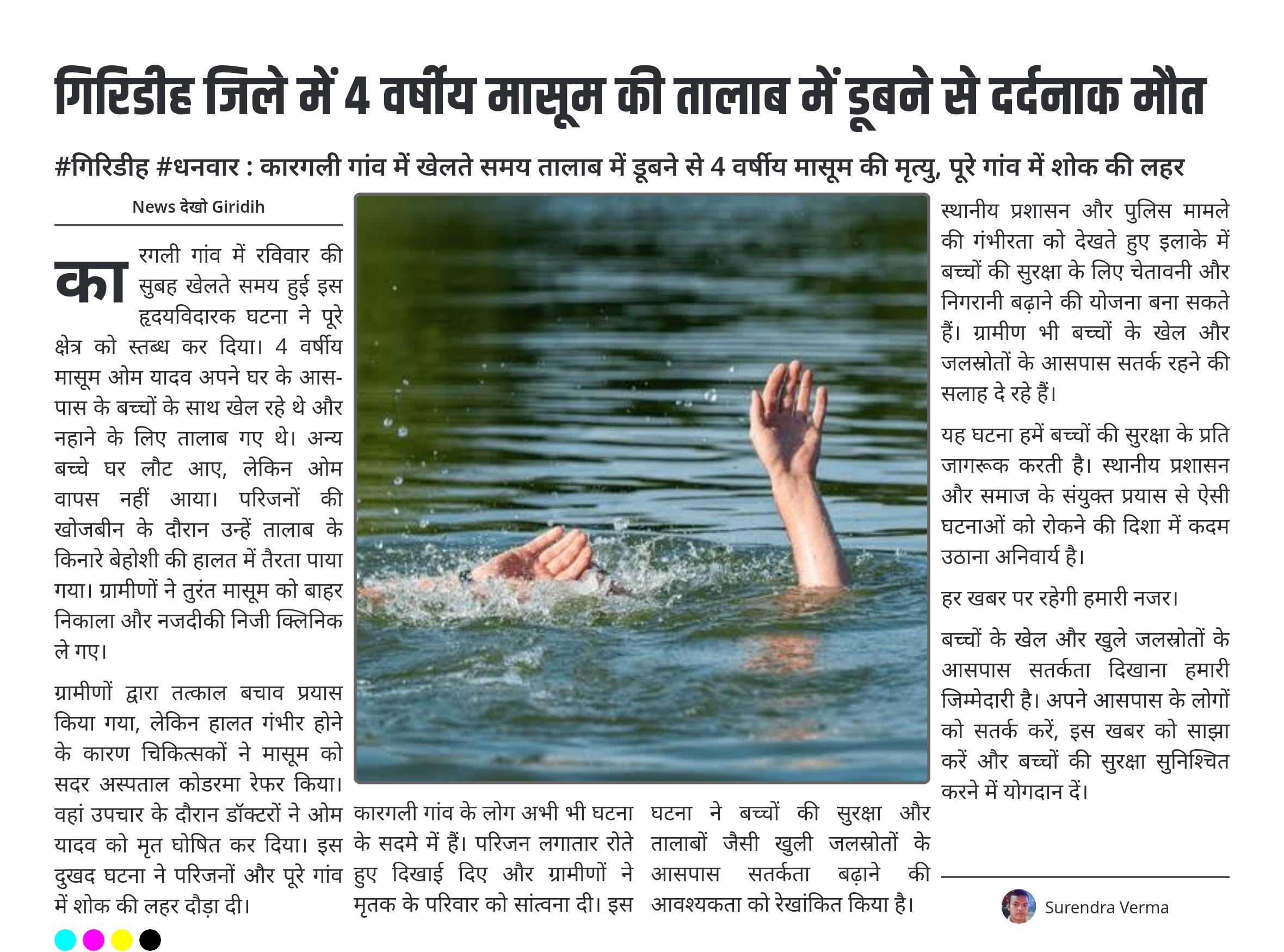 - गिरिडीह जिले, धनवार थाना क्षेत्र के कारगली गांव में रविवार को 4 वर्षीय मासूम ओम यादव की तालाब में डूबने से मृत्यु।