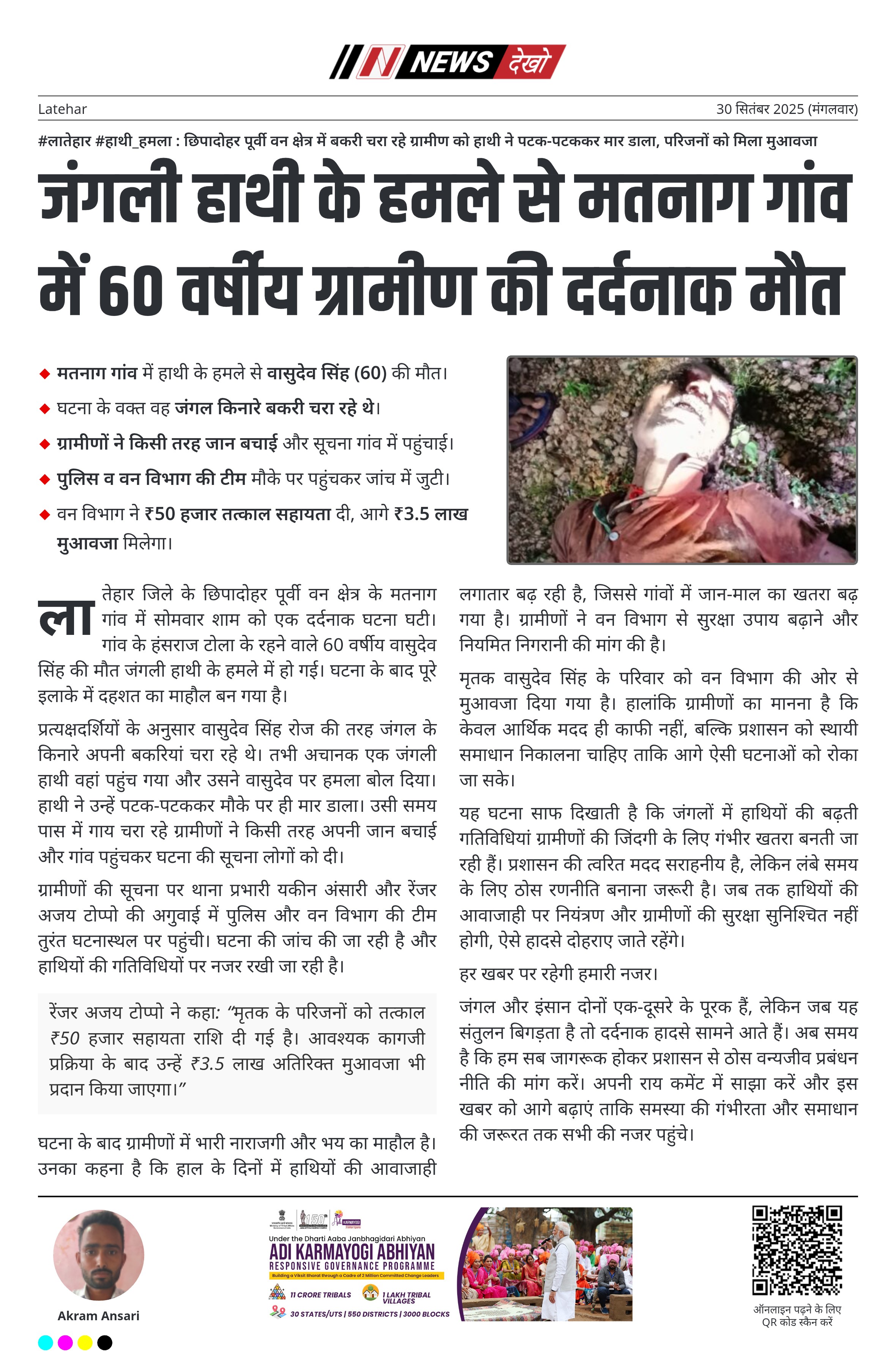 • मतनाग गांव में हाथी के हमले से वासुदेव सिंह (60) की मौत।