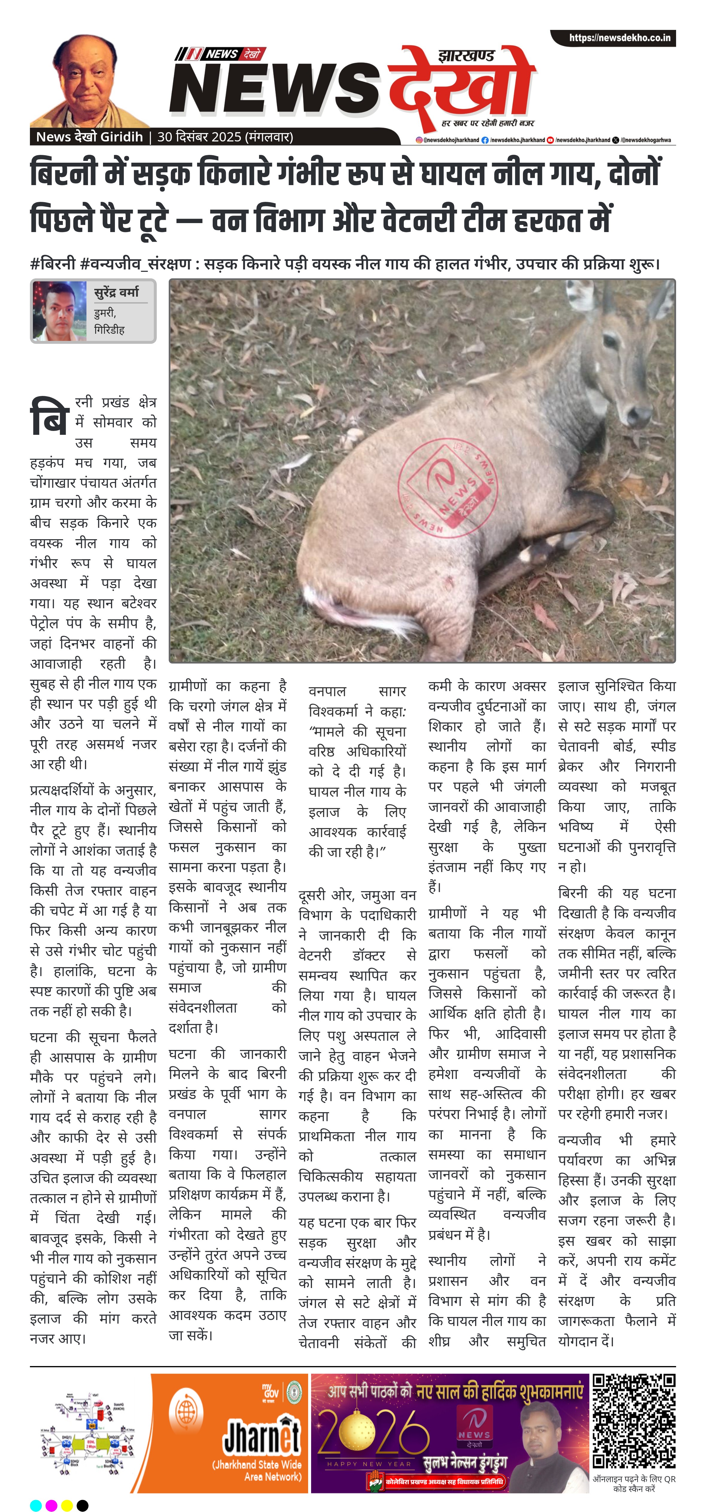 - चरगो–करमा मार्ग पर बटेश्वर पेट्रोल पंप के पास मिली घायल नील गाय।