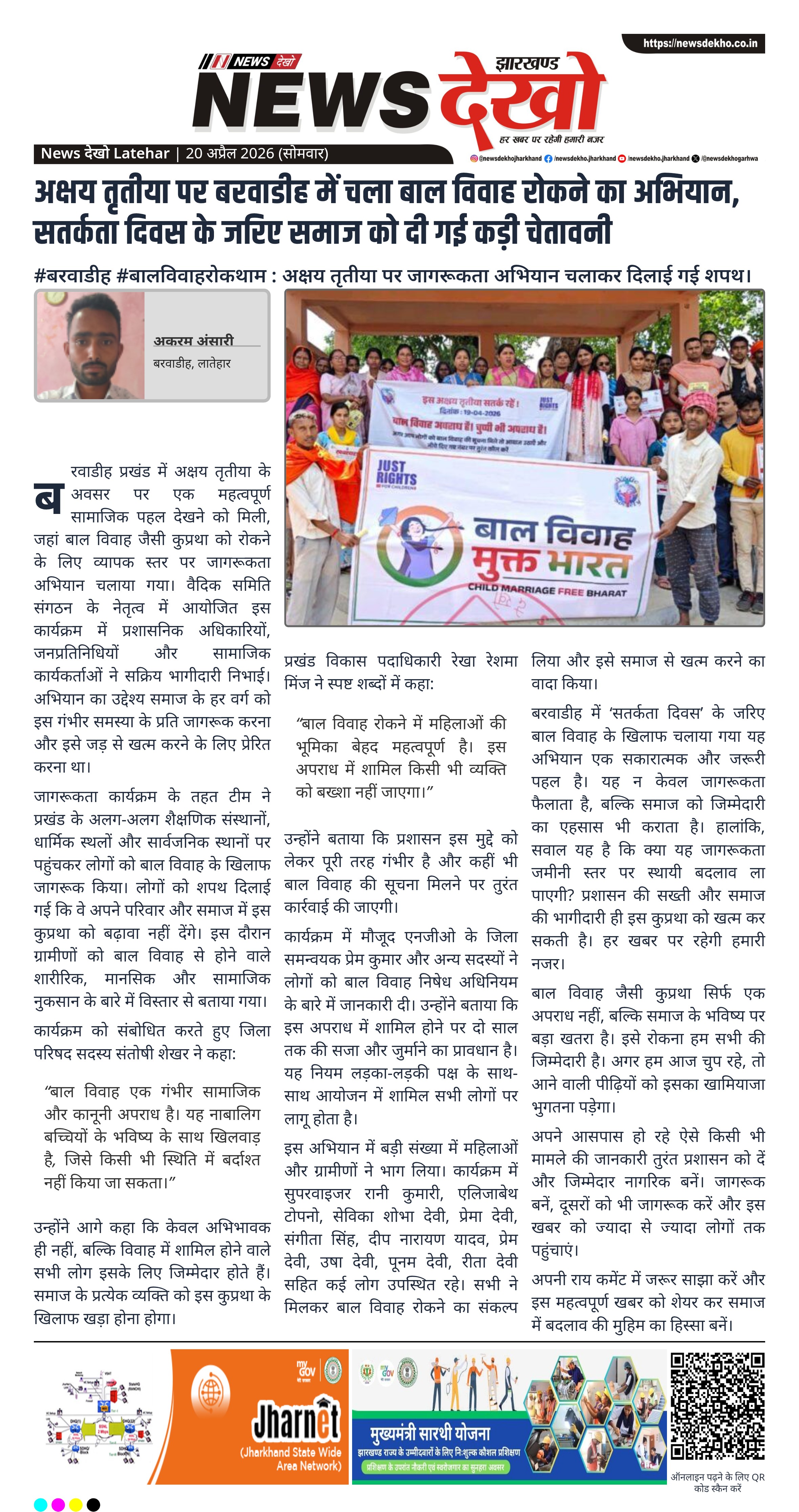 बरवाडीह प्रखंड में अक्षय तृतीया के अवसर पर बाल विवाह रोकने के लिए ‘सतर्कता दिवस’ कार्यक्रम आयोजित किया गया। इस दौरान प्रशासन, जनप्रतिनिधि और सामाजिक संगठनों ने मिलकर लोगों को जागरूक किया। कार्यक्रम के तहत विभिन्न स्थानों पर शपथ दिलाई गई और कानून की जानकारी दी गई। यह पहल समाज में बाल विवाह जैसी कुप्रथा को समाप्त करने की दिशा में महत्वपूर्ण कदम मानी जा रही है।