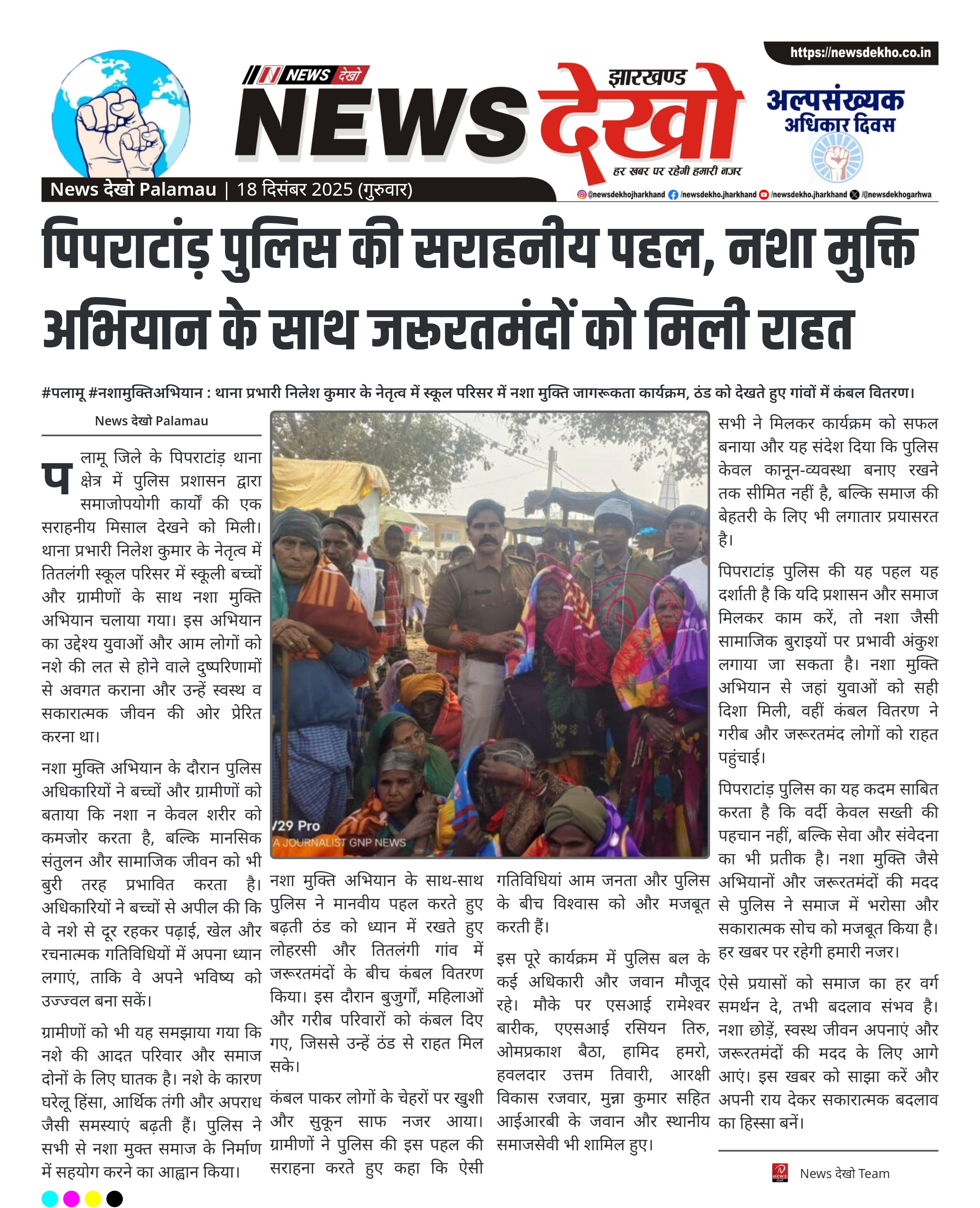 पलामू जिले के पिपराटांड़ थाना क्षेत्र में पुलिस ने समाज के प्रति अपनी जिम्मेदारी का सराहनीय उदाहरण पेश किया है। थाना प्रभारी के नेतृत्व में नशा मुक्ति अभियान चलाकर बच्चों और ग्रामीणों को जागरूक किया गया। इसके साथ ही ठंड से जूझ रहे जरूरतमंद परिवारों के बीच कंबल वितरण कर पुलिस ने मानवीय संवेदना का परिचय दिया। इस पहल से क्षेत्र में सकारात्मक संदेश गया है।