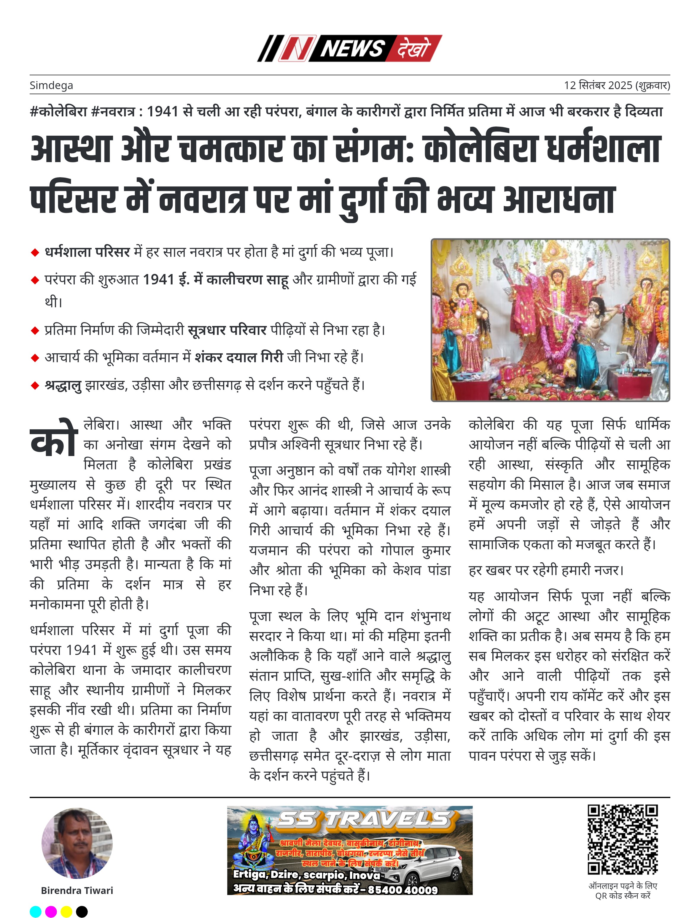 कोलेबिरा। आस्था और भक्ति का अनोखा संगम देखने को मिलता है कोलेबिरा प्रखंड मुख्यालय से कुछ ही दूरी पर स्थित धर्मशाला परिसर में। शारदीय नवरात्र पर यहाँ मां आदि शक्ति जगदंबा जी की प्रतिमा स्थापित होती है और भक्तों की भारी भीड़ उमड़ती है। मान्यता है कि मां की प्रतिमा के दर्शन मात्र से हर मनोकामना पूरी होती है।