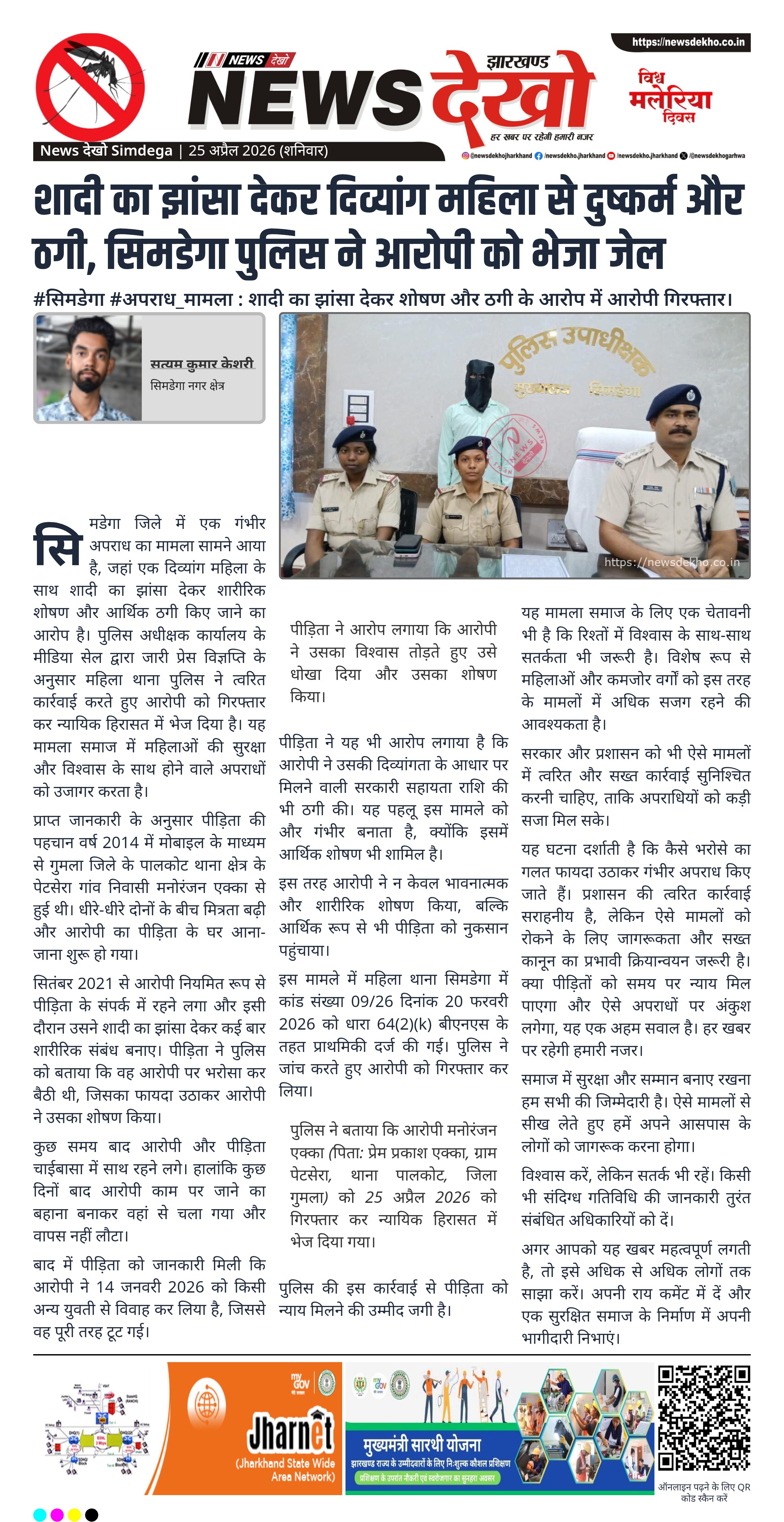 सिमडेगा जिले में एक गंभीर अपराध का मामला सामने आया है, जहां एक दिव्यांग महिला के साथ शादी का झांसा देकर शारीरिक शोषण और आर्थिक ठगी किए जाने का आरोप है। पुलिस अधीक्षक कार्यालय के मीडिया सेल द्वारा जारी प्रेस विज्ञप्ति के अनुसार महिला थाना पुलिस ने त्वरित कार्रवाई करते हुए आरोपी को गिरफ्तार कर न्यायिक हिरासत में भेज दिया है। यह मामला समाज में महिलाओं की सुरक्षा और विश्वास के साथ होने वाले अपराधों को उजागर करता है।