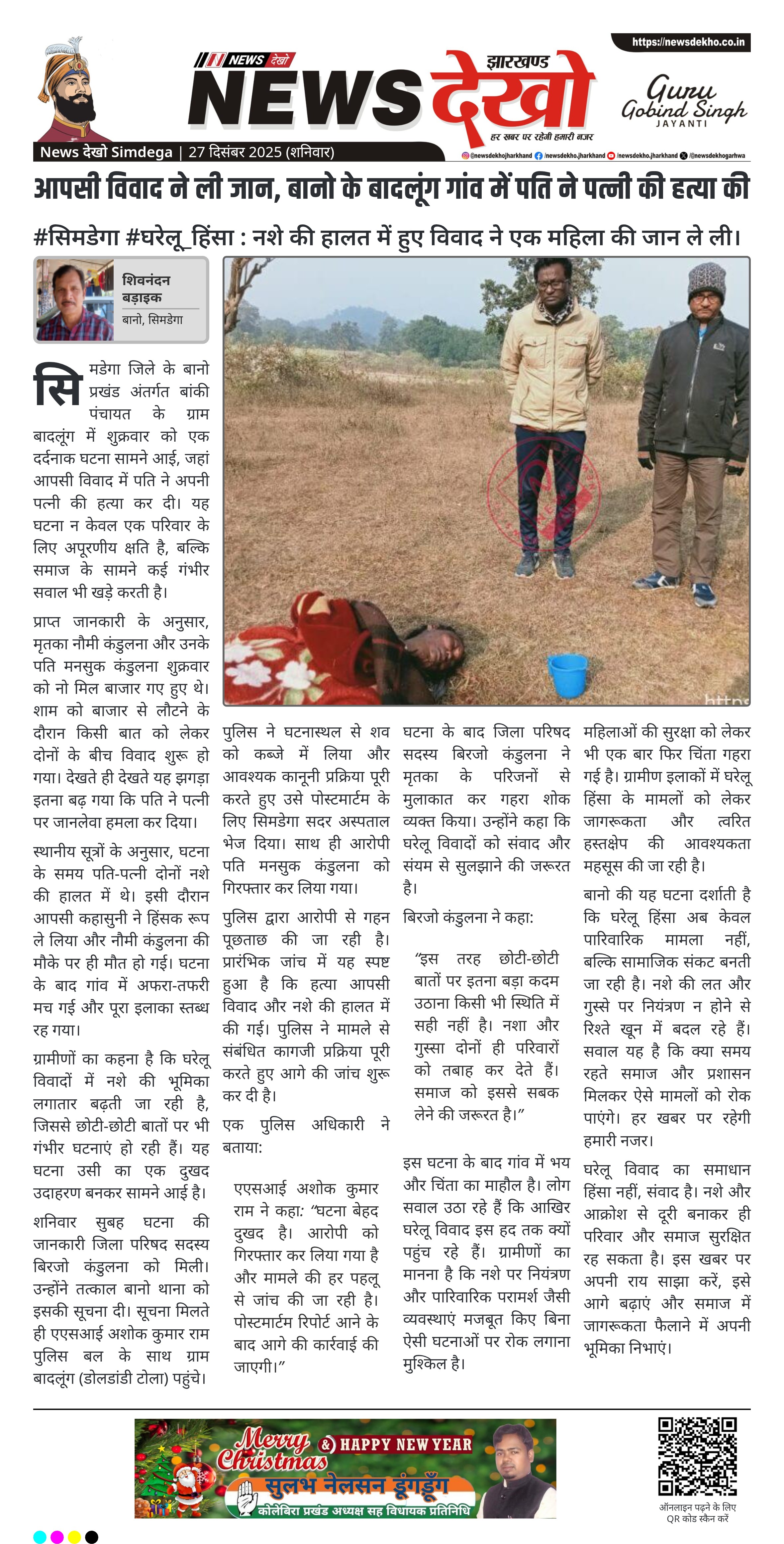 सिमडेगा जिले के बानो प्रखंड अंतर्गत बांकी पंचायत के ग्राम बादलूंग में शुक्रवार को एक दर्दनाक घटना सामने आई, जहां आपसी विवाद में पति ने अपनी पत्नी की हत्या कर दी। यह घटना न केवल एक परिवार के लिए अपूरणीय क्षति है, बल्कि समाज के सामने कई गंभीर सवाल भी खड़े करती है।