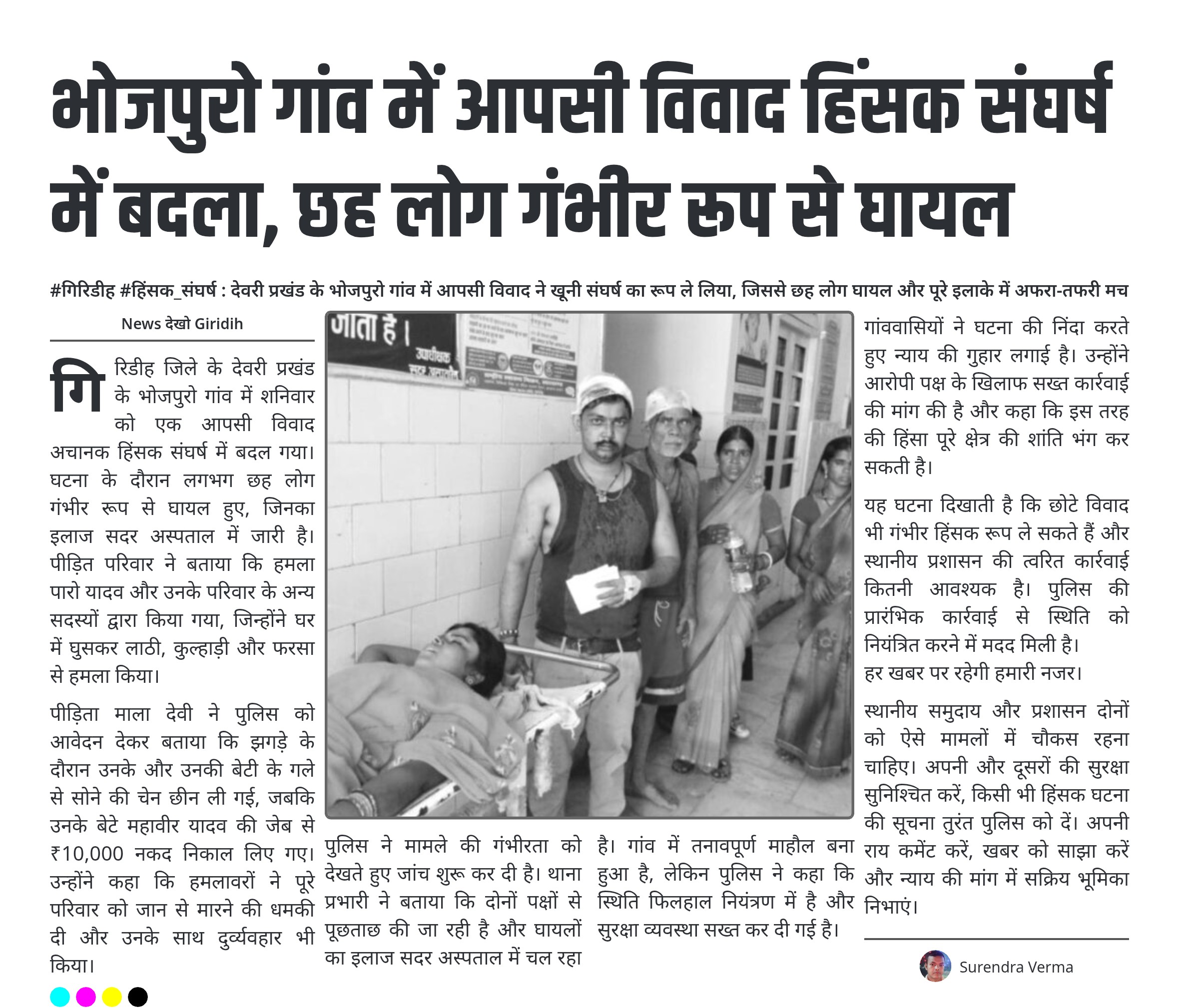 #गिरिडीह #हिंसक_संघर्ष : देवरी प्रखंड के भोजपुरो गांव में आपसी विवाद ने खूनी संघर्ष का रूप ले लिया, जिससे छह लोग घायल और पूरे इलाके में अफरा-तफरी मच गई।