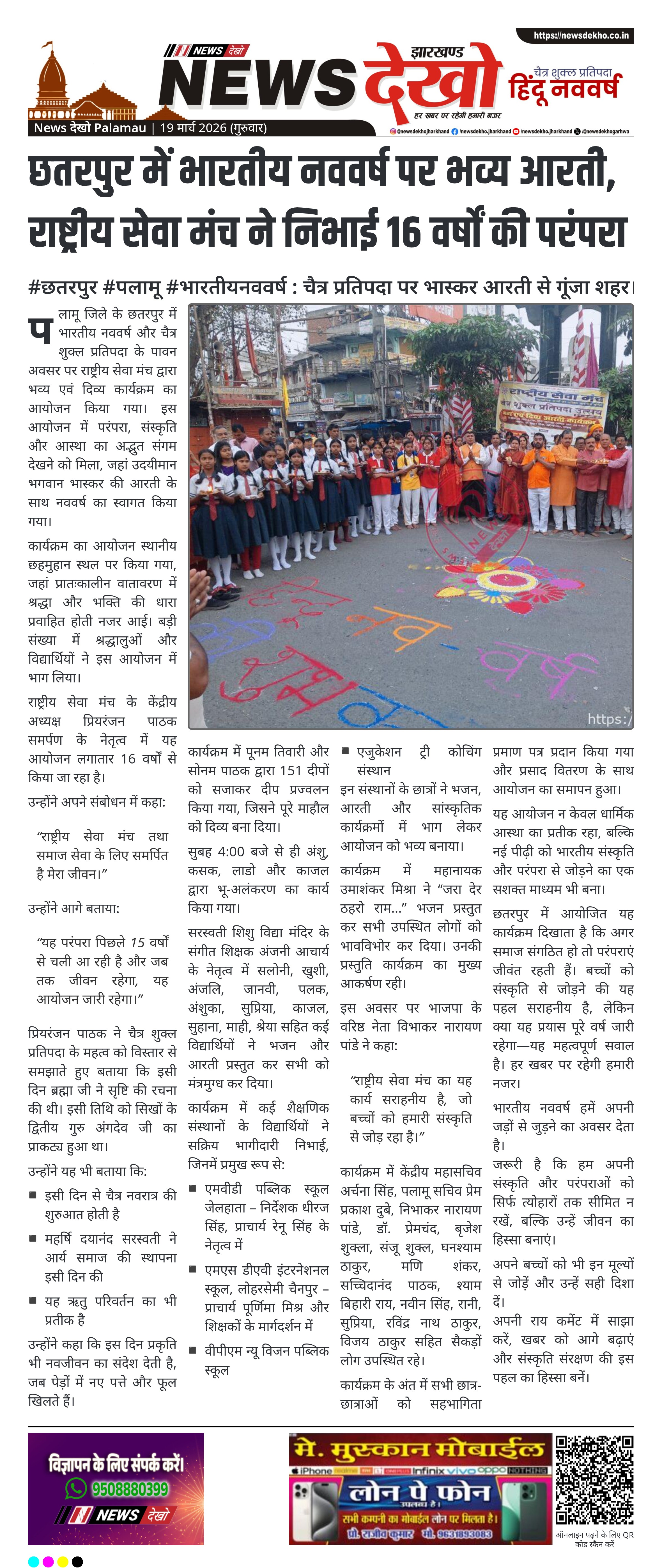 पलामू के छतरपुर में भारतीय नववर्ष एवं चैत्र शुक्ल प्रतिपदा के अवसर पर राष्ट्रीय सेवा मंच द्वारा भव्य कार्यक्रम आयोजित किया गया। उदयीमान सूर्य भगवान भास्कर की आरती के साथ आयोजन की शुरुआत हुई। विभिन्न स्कूलों के विद्यार्थियों ने भजन और सांस्कृतिक प्रस्तुतियां दीं। कार्यक्रम में बड़ी संख्या में लोगों की भागीदारी देखी गई।