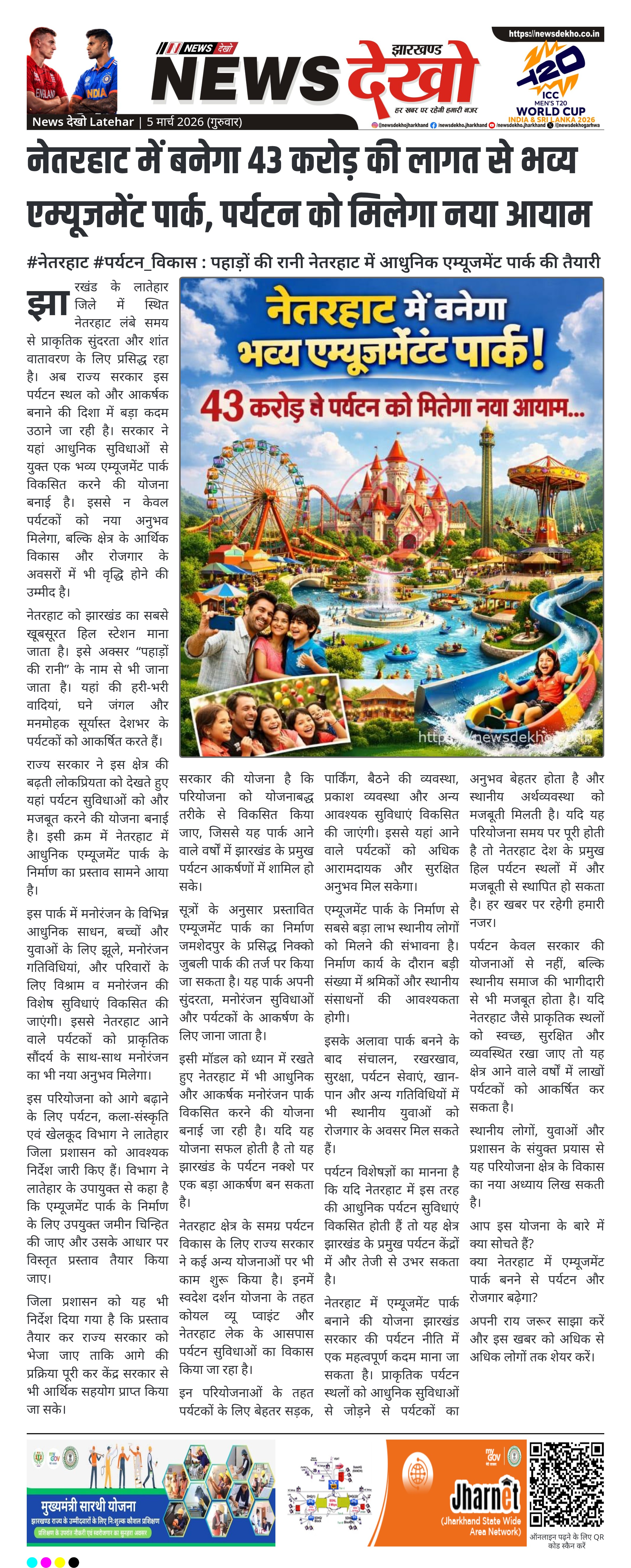 झारखंड के प्रसिद्ध पर्यटन स्थल नेतरहाट में जल्द ही पर्यटकों को नया और आधुनिक आकर्षण मिलने वाला है। राज्य सरकार यहां करीब 43 करोड़ रुपये की लागत से भव्य एम्यूजमेंट पार्क बनाने की योजना पर काम कर रही है। इस परियोजना का उद्देश्य नेतरहाट पर्यटन क्षेत्र को और विकसित करना तथा स्थानीय स्तर पर रोजगार के नए अवसर पैदा करना है।
