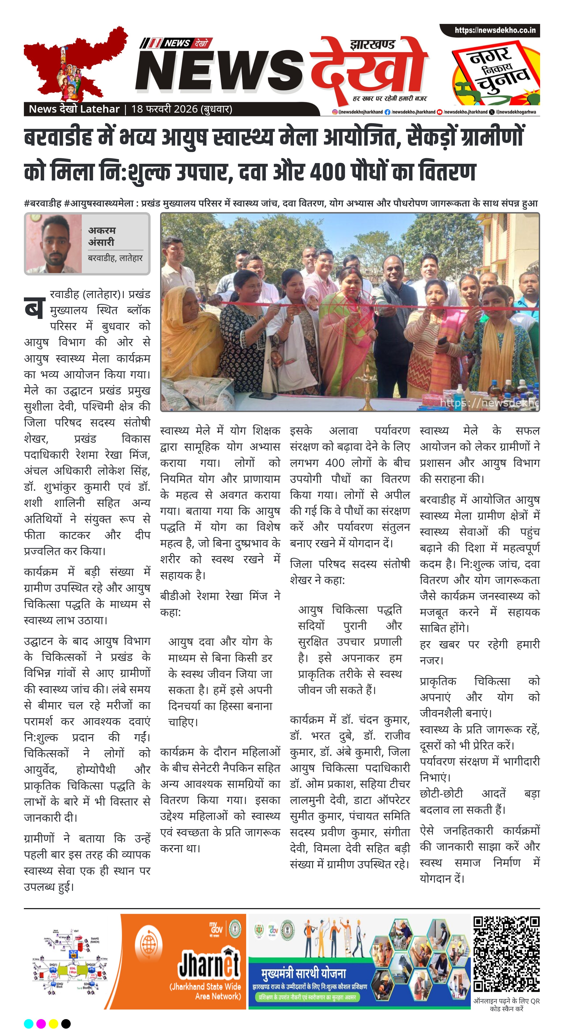 लातेहार जिले के बरवाडीह प्रखंड मुख्यालय में आयुष विभाग की ओर से भव्य आयुष स्वास्थ्य मेला आयोजित किया गया। कार्यक्रम में सैकड़ों ग्रामीणों की नि:शुल्क स्वास्थ्य जांच कर दवाएं वितरित की गईं। साथ ही महिलाओं को सेनेटरी नैपकिन और लगभग 400 लोगों को पौधे भी दिए गए।