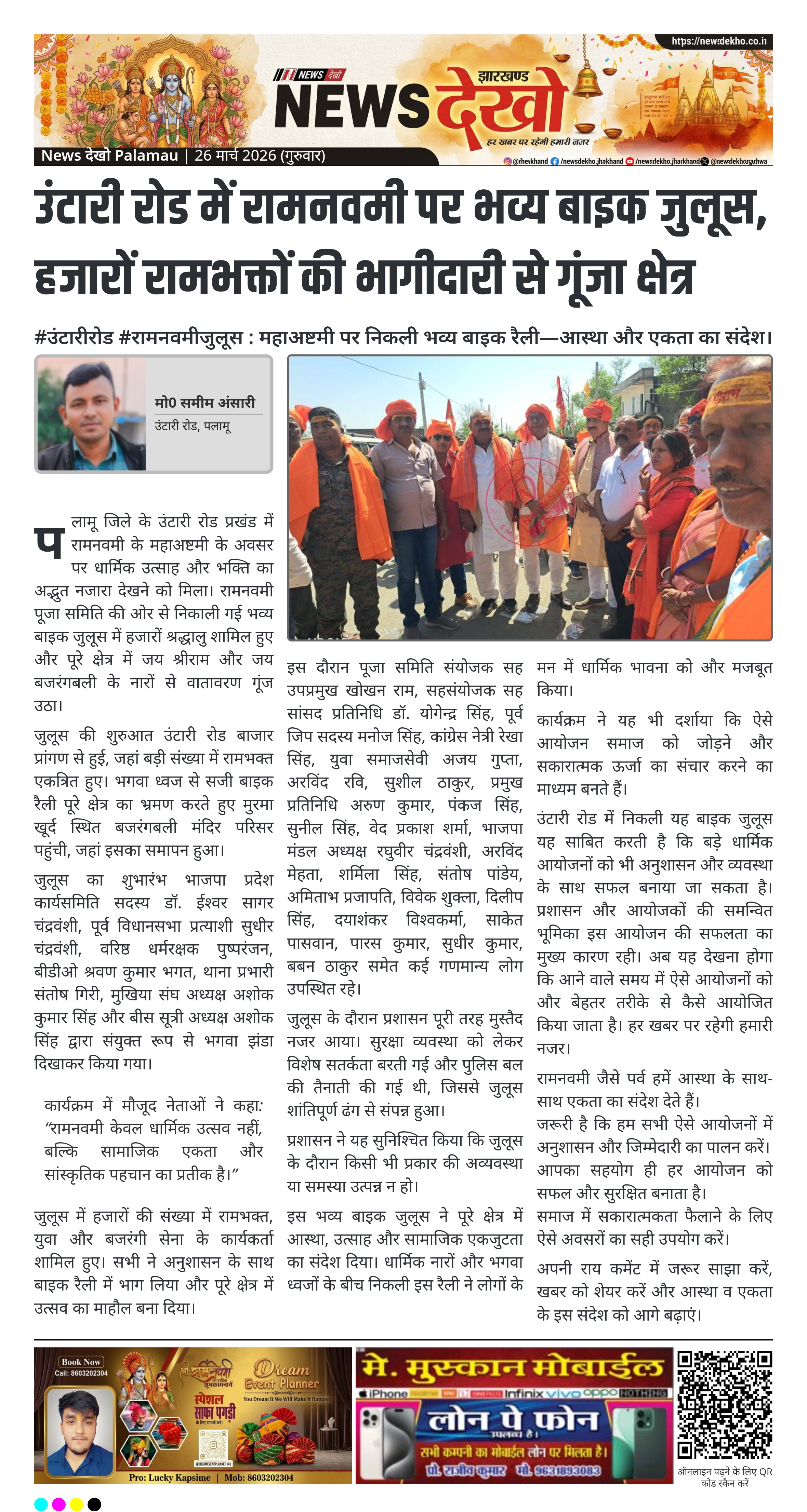 पलामू जिले के उंटारी रोड प्रखंड में रामनवमी के महाअष्टमी अवसर पर भव्य बाइक जुलूस निकाला गया। हजारों रामभक्तों ने भगवा ध्वज के साथ पूरे क्षेत्र का भ्रमण किया। जनप्रतिनिधियों और अधिकारियों ने संयुक्त रूप से जुलूस का शुभारंभ किया। प्रशासन की निगरानी में कार्यक्रम शांतिपूर्ण ढंग से संपन्न हुआ और क्षेत्र में उत्साह का माहौल रहा।