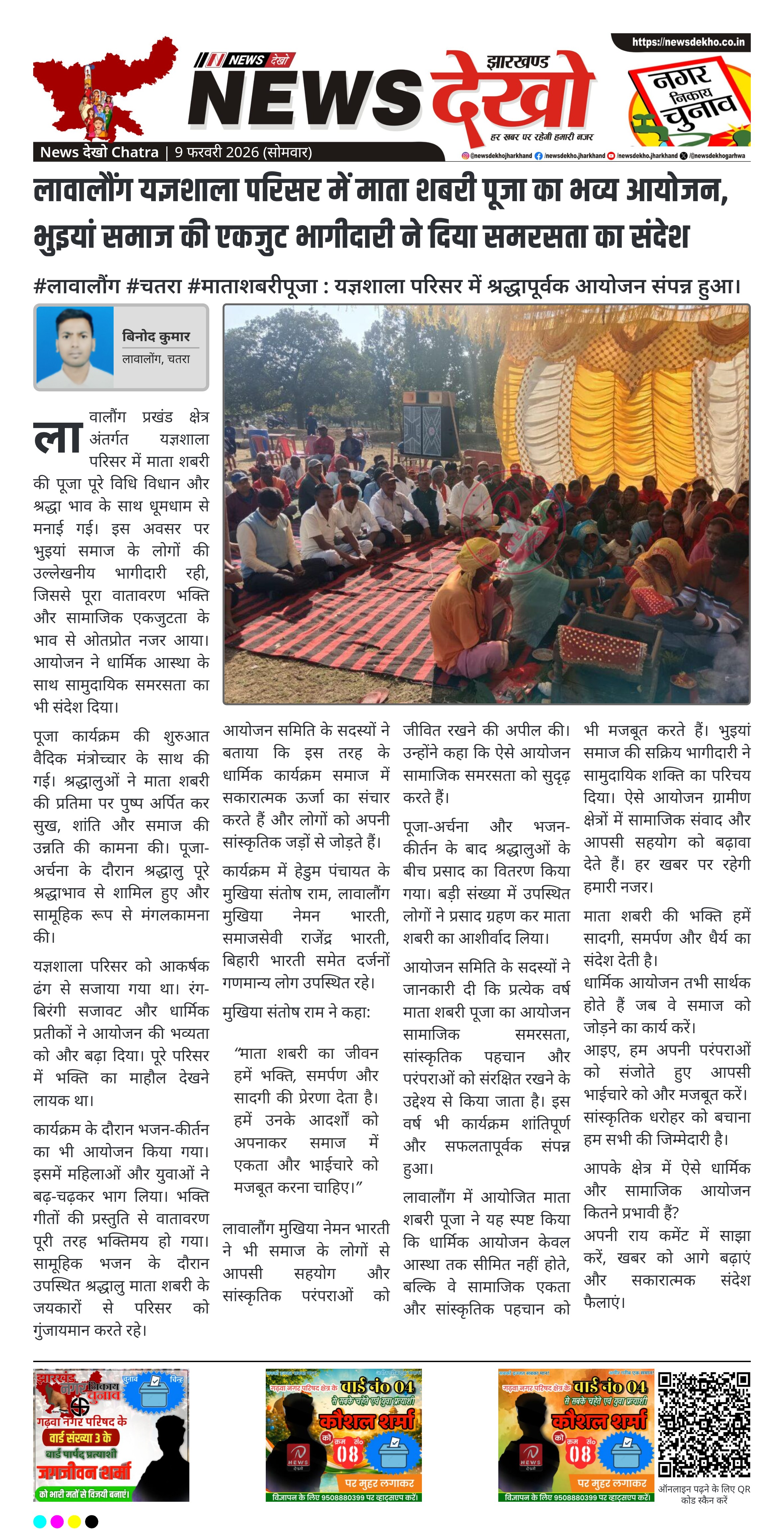 चतरा जिले के लावालौंग प्रखंड स्थित यज्ञशाला परिसर में माता शबरी की पूजा पूरे विधि विधान के साथ संपन्न हुई। कार्यक्रम में भुइयां समाज की बड़ी भागीदारी देखने को मिली। वैदिक मंत्रोच्चार, भजन कीर्तन और सामूहिक प्रार्थना के बीच श्रद्धालुओं ने सुख समृद्धि की कामना की। जनप्रतिनिधियों ने समाज में एकता और सांस्कृतिक परंपराओं को मजबूत करने का संदेश दिया।