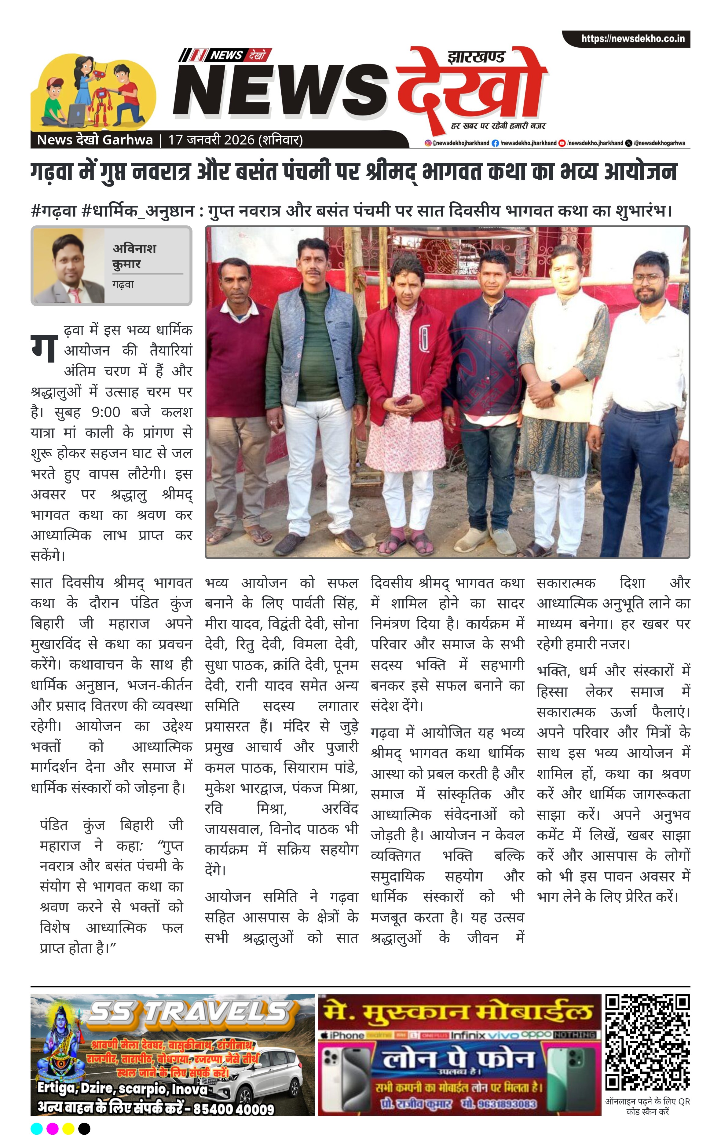 गढ़वा में गुप्त नवरात्र और बसंत पंचमी के पावन अवसर पर श्रीमद् भागवत कथा का सात दिवसीय भव्य आयोजन 20 जनवरी 2026 से शुरू होगा। कलश यात्रा मां काली के प्रांगण से सुबह 9:00 बजे निकलकर सहजन घाट से जल भरते हुए लौटेगी। कथा प्रवक्ता पंडित कुंज बिहारी जी महाराज अपने मुखारविंद से भक्तों को श्रीमद् भागवत का अमृत पान कराएंगे। आयोजन में विभिन्न धार्मिक अनुष्ठान, भजन-कीर्तन और प्रसाद वितरण की भी व्यवस्था होगी।