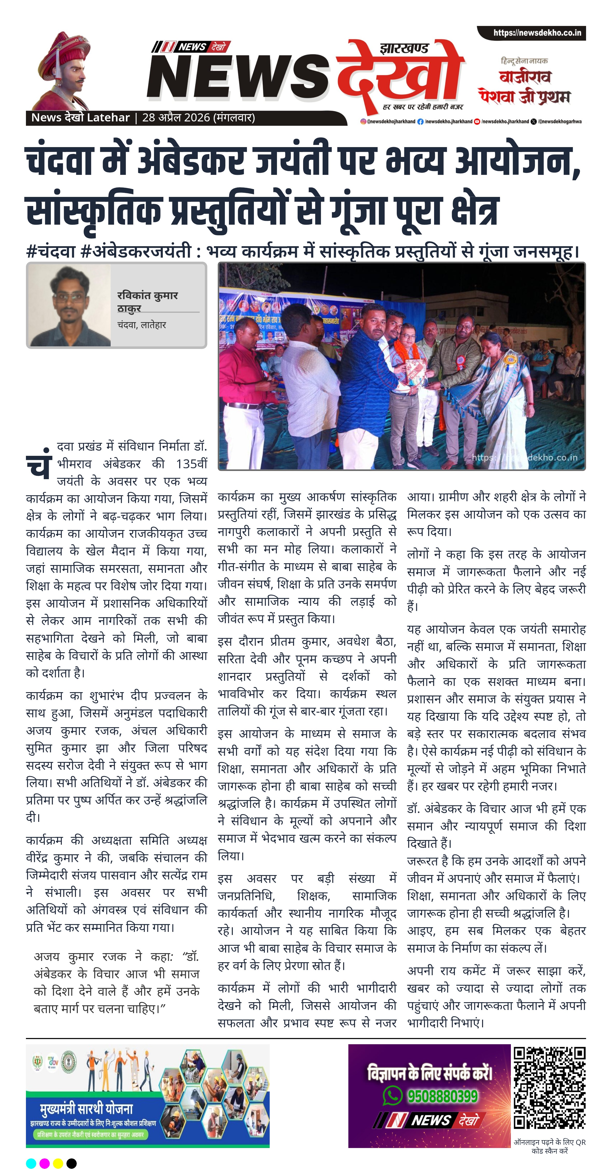 लातेहार जिले के चंदवा प्रखंड में डॉ. भीमराव अंबेडकर की 135वीं जयंती धूमधाम से मनाई गई। राजकीयकृत उच्च विद्यालय के मैदान में आयोजित कार्यक्रम में प्रशासनिक अधिकारियों, जनप्रतिनिधियों और सैकड़ों लोगों ने भाग लिया। सांस्कृतिक प्रस्तुतियों के माध्यम से बाबा साहेब के विचारों को जन-जन तक पहुंचाया गया। आयोजन ने सामाजिक समरसता और संविधान के मूल्यों को मजबूत करने का संदेश दिया।