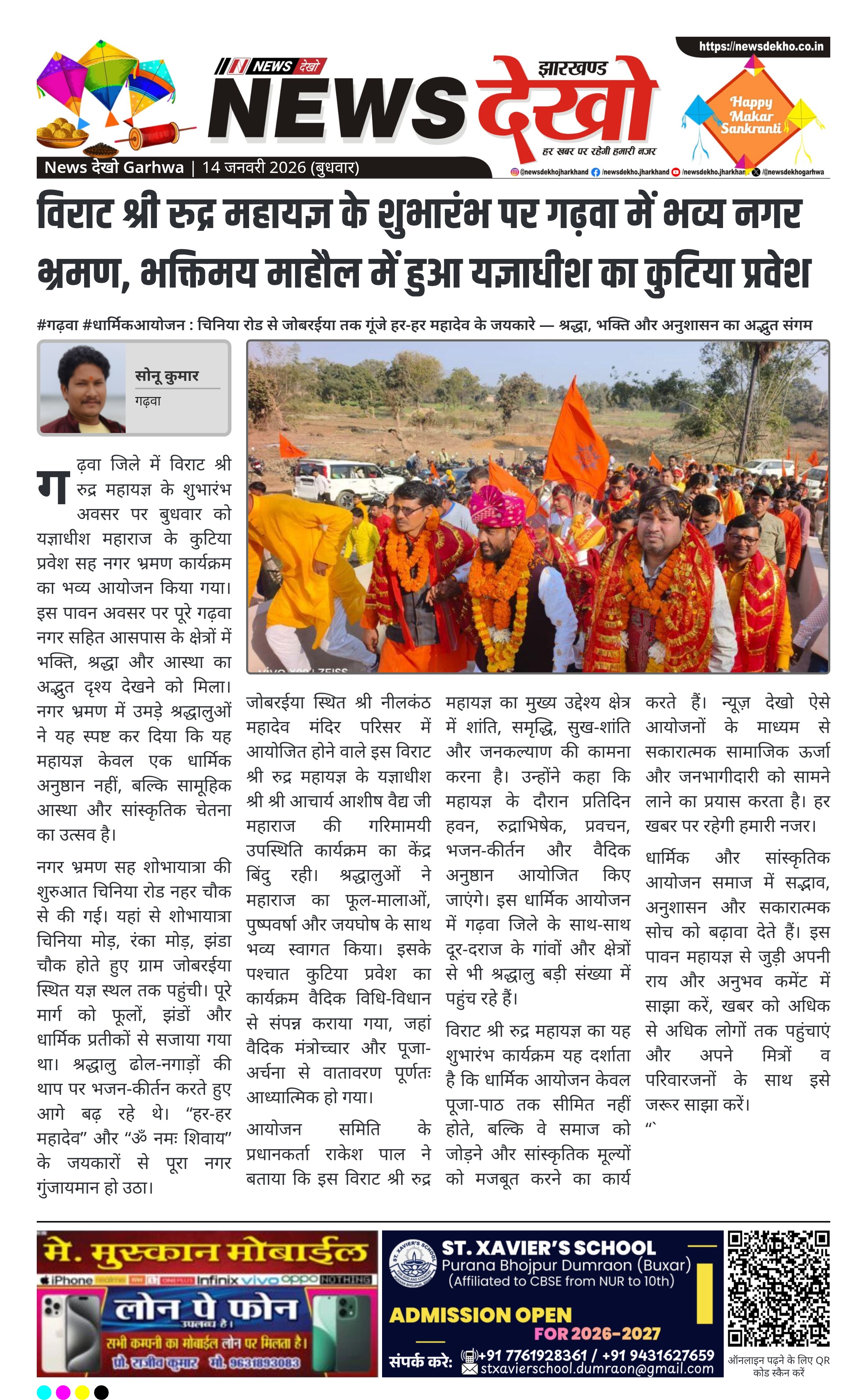 गढ़वा जिले में विराट श्री रुद्र महायज्ञ के शुभारंभ अवसर पर बुधवार को यज्ञाधीश महाराज के कुटिया प्रवेश सह नगर भ्रमण कार्यक्रम का भव्य आयोजन किया गया। इस पावन अवसर पर पूरे गढ़वा नगर सहित आसपास के क्षेत्रों में भक्ति, श्रद्धा और आस्था का अद्भुत दृश्य देखने को मिला। नगर भ्रमण में उमड़े श्रद्धालुओं ने यह स्पष्ट कर दिया कि यह महायज्ञ केवल एक धार्मिक अनुष्ठान नहीं, बल्कि सामूहिक आस्था और सांस्कृतिक चेतना का उत्सव है।