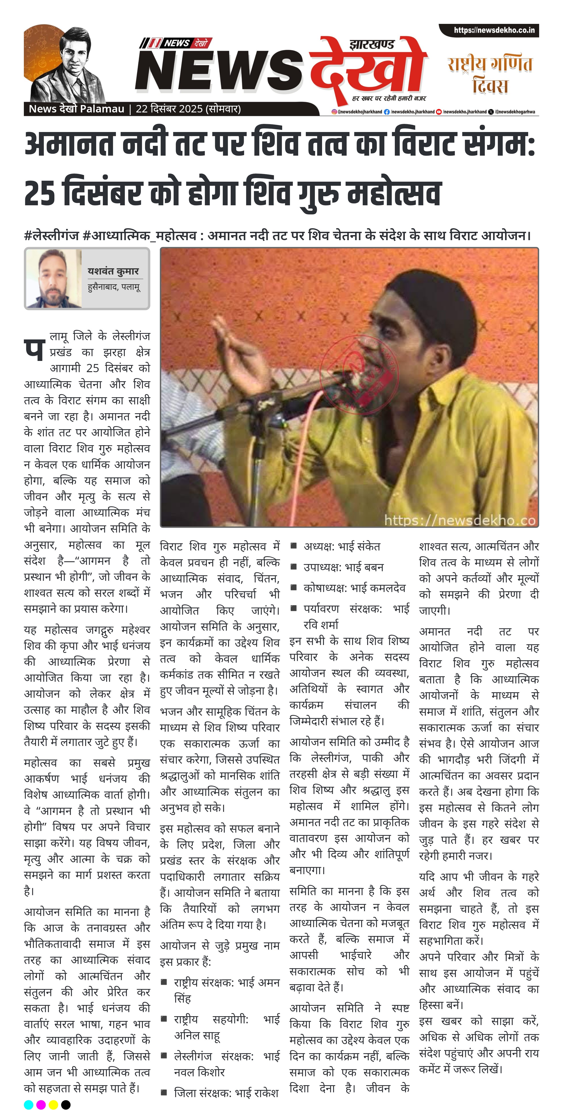 पलामू जिले के लेस्लीगंज प्रखंड अंतर्गत झरहा अमानत नदी तट पर 25 दिसंबर को विराट शिव गुरु महोत्सव का आयोजन किया जाएगा। इस महोत्सव में आध्यात्मिक गुरु भाई धनंजय “आगमन है तो प्रस्थान भी होगी” विषय पर विशेष वार्ता करेंगे। आयोजन का उद्देश्य समाज को आध्यात्मिक दिशा देना और शिव तत्व के मूल भाव को जनमानस तक पहुंचाना है। सुबह 10 बजे से शाम 4 बजे तक चलने वाले इस कार्यक्रम में बड़ी संख्या में शिव शिष्यों के जुटने की संभावना है।
