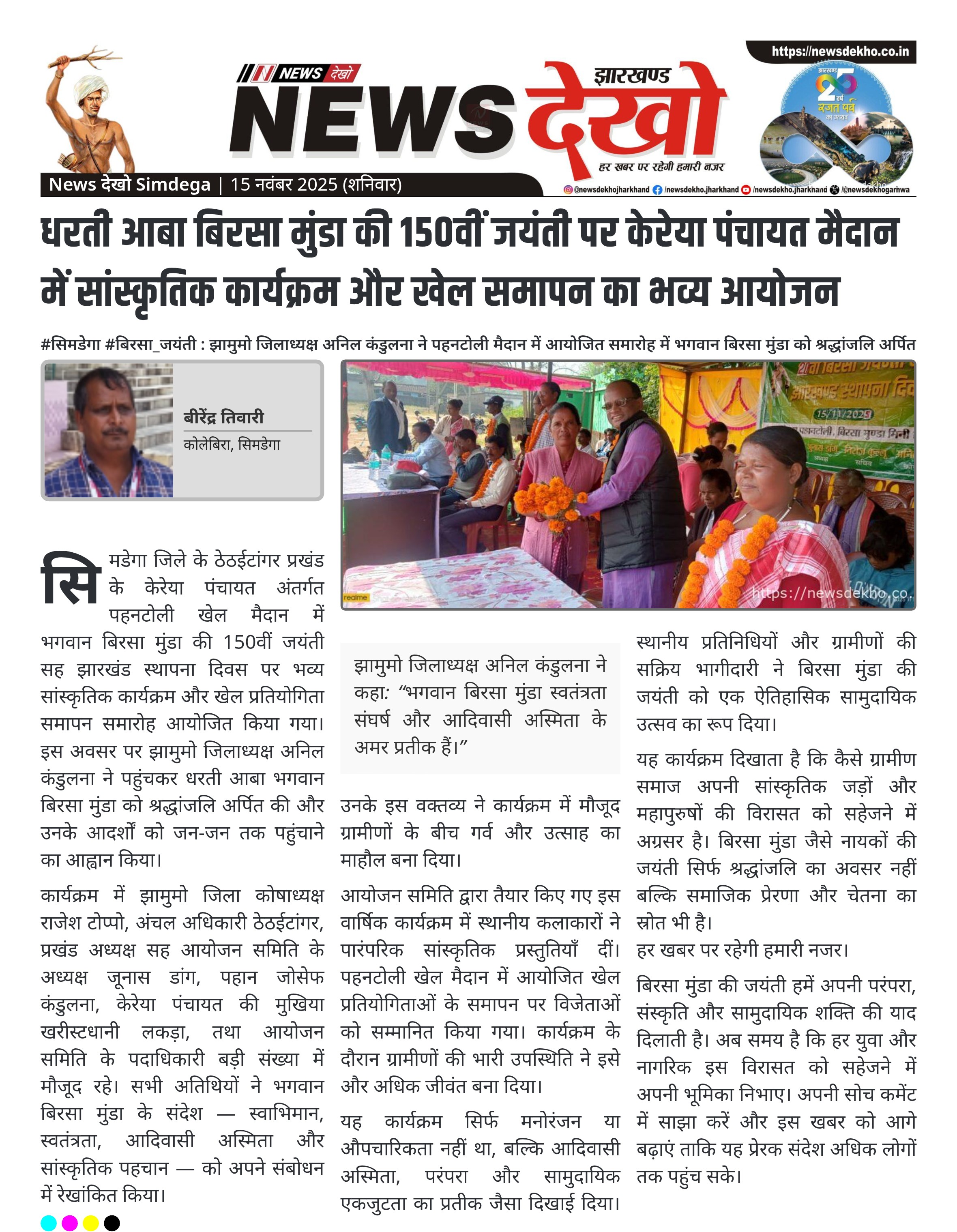 झामुमो जिलाध्यक्ष अनिल कंडुलना ने कहा: “भगवान बिरसा मुंडा स्वतंत्रता संघर्ष और आदिवासी अस्मिता के अमर प्रतीक हैं।”