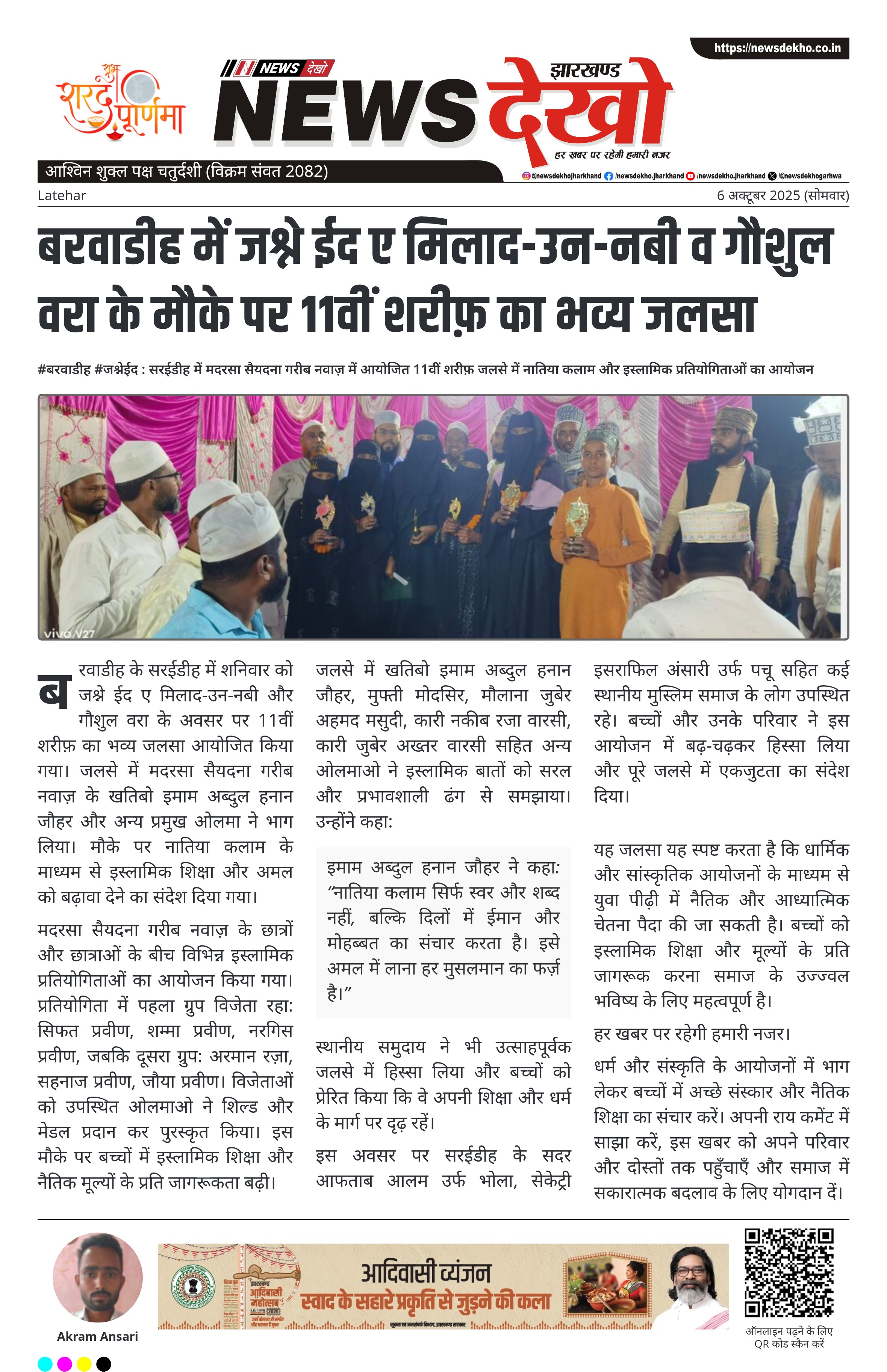 बरवाडीह के सरईडीह में शनिवार को जश्ने ईद ए मिलाद-उन-नबी और गौशुल वरा के अवसर पर 11वीं शरीफ़ का भव्य जलसा आयोजित किया गया। जलसे में मदरसा सैयदना गरीब नवाज़ के खतिबो इमाम अब्दुल हनान जौहर और अन्य प्रमुख ओलमा ने भाग लिया। मौके पर नातिया कलाम के माध्यम से इस्लामिक शिक्षा और अमल को बढ़ावा देने का संदेश दिया गया।