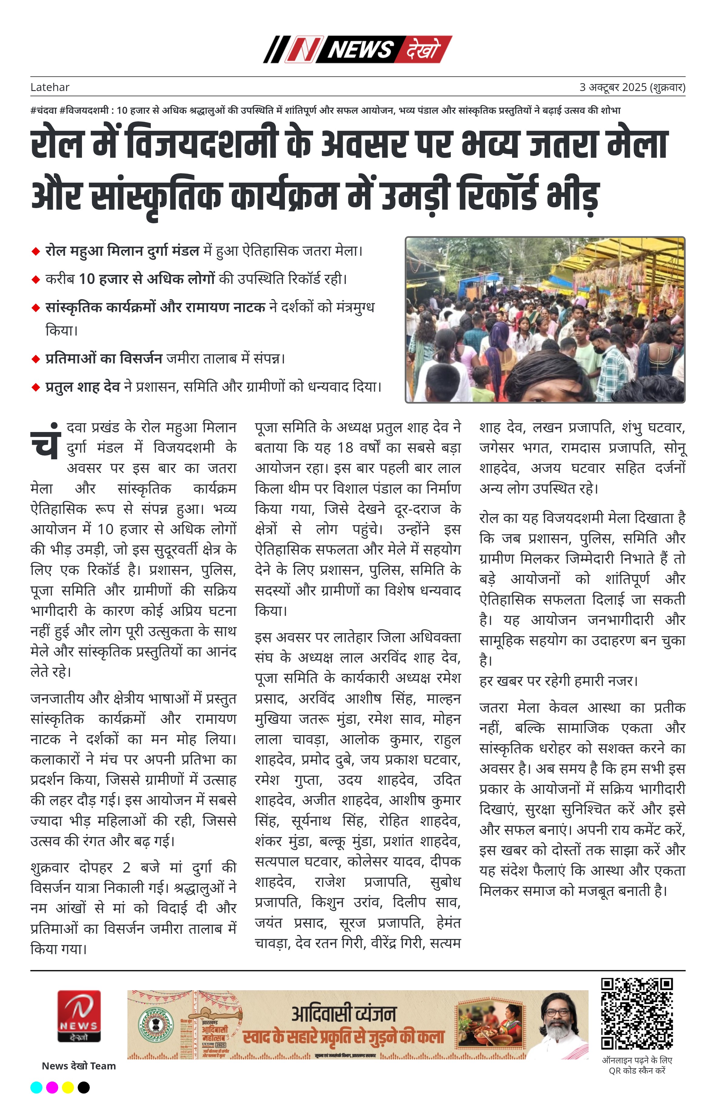 • रोल महुआ मिलान दुर्गा मंडल में हुआ ऐतिहासिक जतरा मेला।