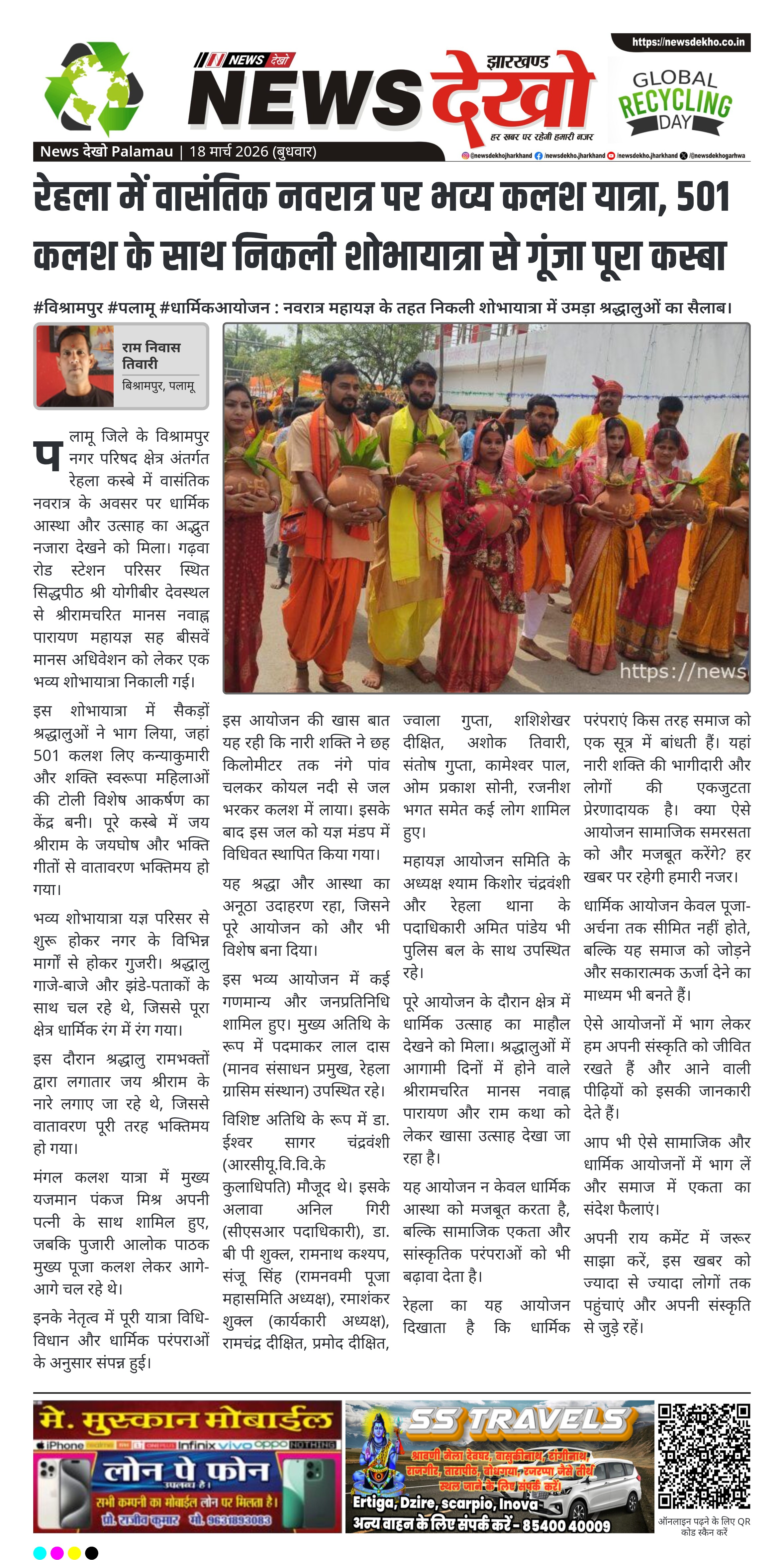 पलामू जिले के विश्रामपुर नगर परिषद क्षेत्र अंतर्गत रेहला कस्बे में वासंतिक नवरात्र के अवसर पर धार्मिक आस्था और उत्साह का अद्भुत नजारा देखने को मिला। गढ़वा रोड स्टेशन परिसर स्थित सिद्धपीठ श्री योगीबीर देवस्थल से श्रीरामचरित मानस नवाह्न पारायण महायज्ञ सह बीसवें मानस अधिवेशन को लेकर एक भव्य शोभायात्रा निकाली गई।
