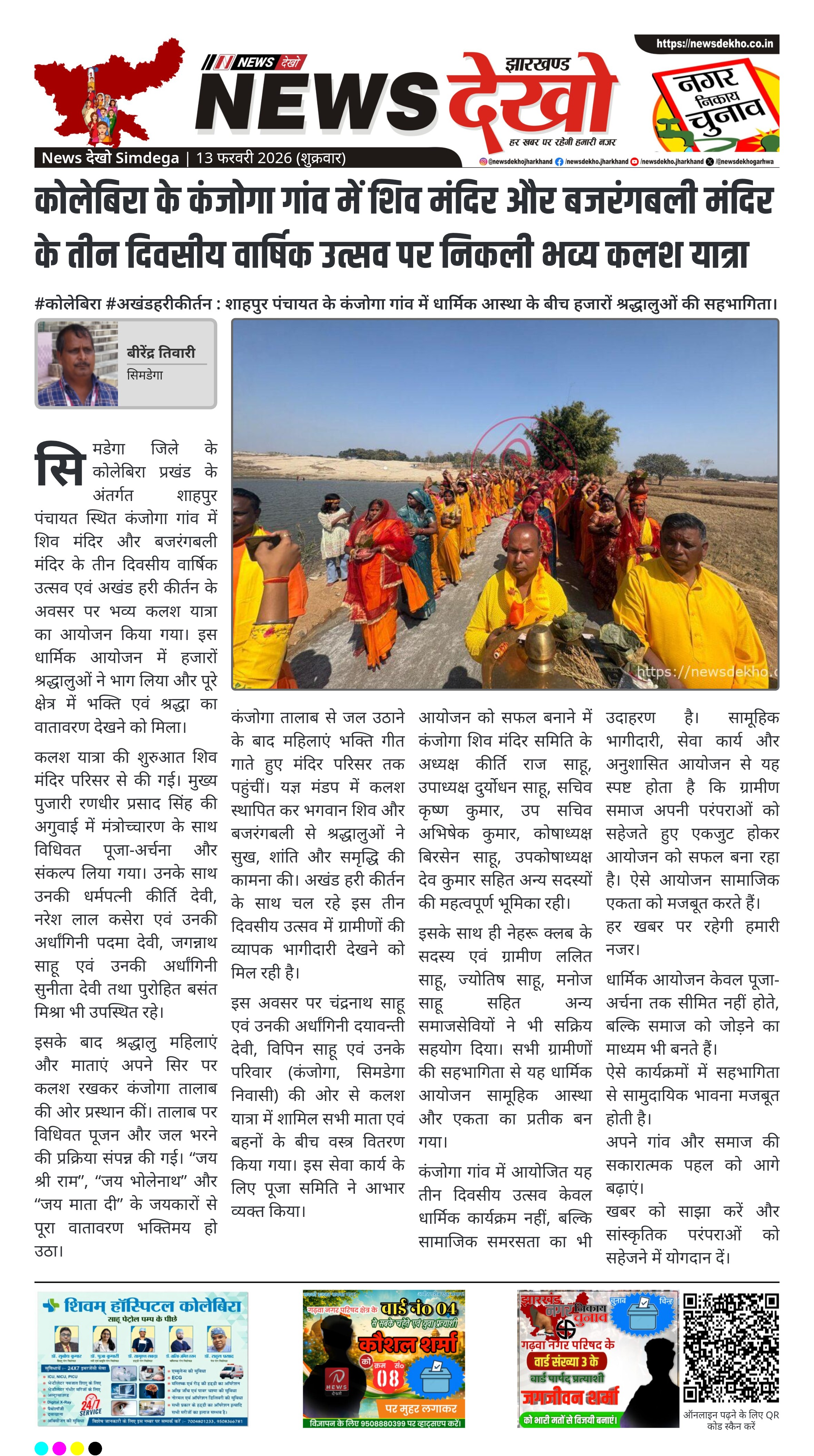 सिमडेगा जिले के कोलेबिरा प्रखंड अंतर्गत शाहपुर पंचायत के कंजोगा गांव में शिव मंदिर और बजरंगबली मंदिर के तीन दिवसीय वार्षिक उत्सव के अवसर पर भव्य कलश यात्रा निकाली गई। अखंड हरी कीर्तन के इस आयोजन में हजारों श्रद्धालुओं ने भाग लिया और धार्मिक आस्था का अद्भुत दृश्य देखने को मिला।
