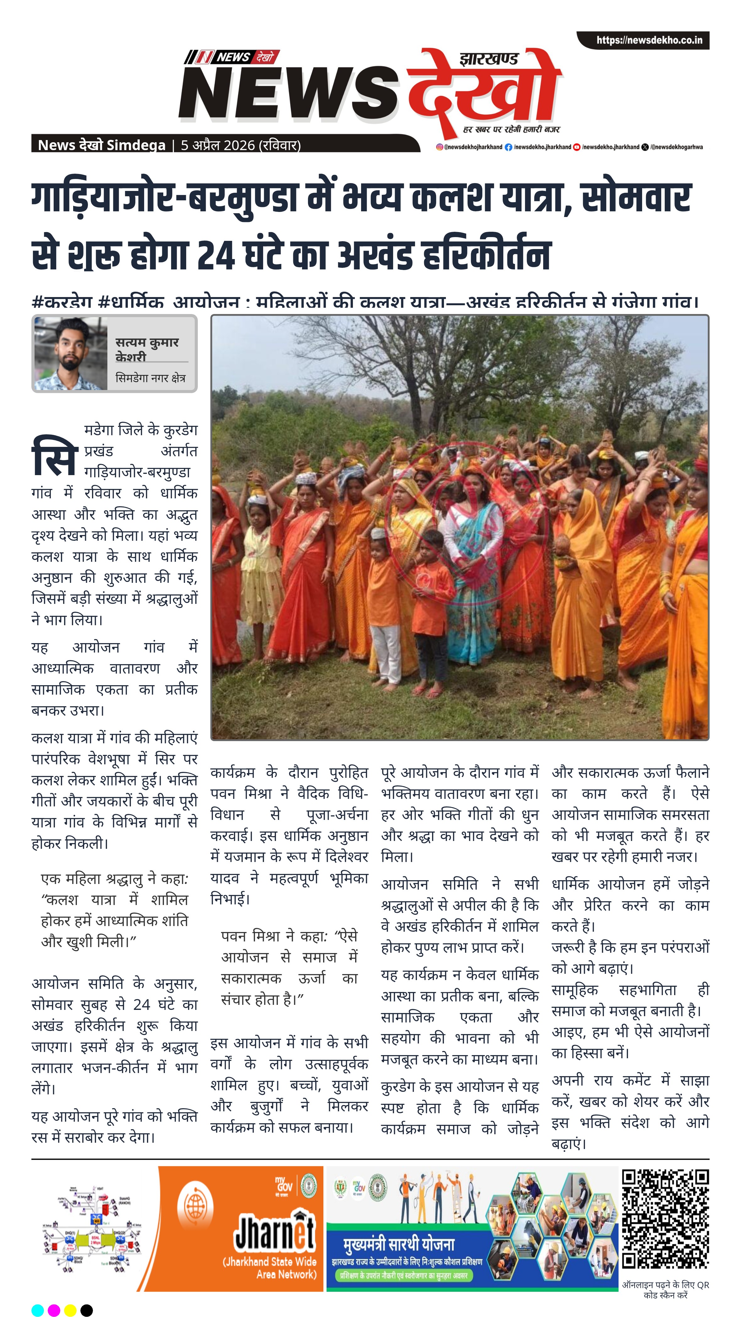 सिमडेगा जिले के कुरडेग प्रखंड अंतर्गत गाड़ियाजोर-बरमुण्डा गांव में रविवार को धार्मिक आस्था और भक्ति का अद्भुत दृश्य देखने को मिला। यहां भव्य कलश यात्रा के साथ धार्मिक अनुष्ठान की शुरुआत की गई, जिसमें बड़ी संख्या में श्रद्धालुओं ने भाग लिया।