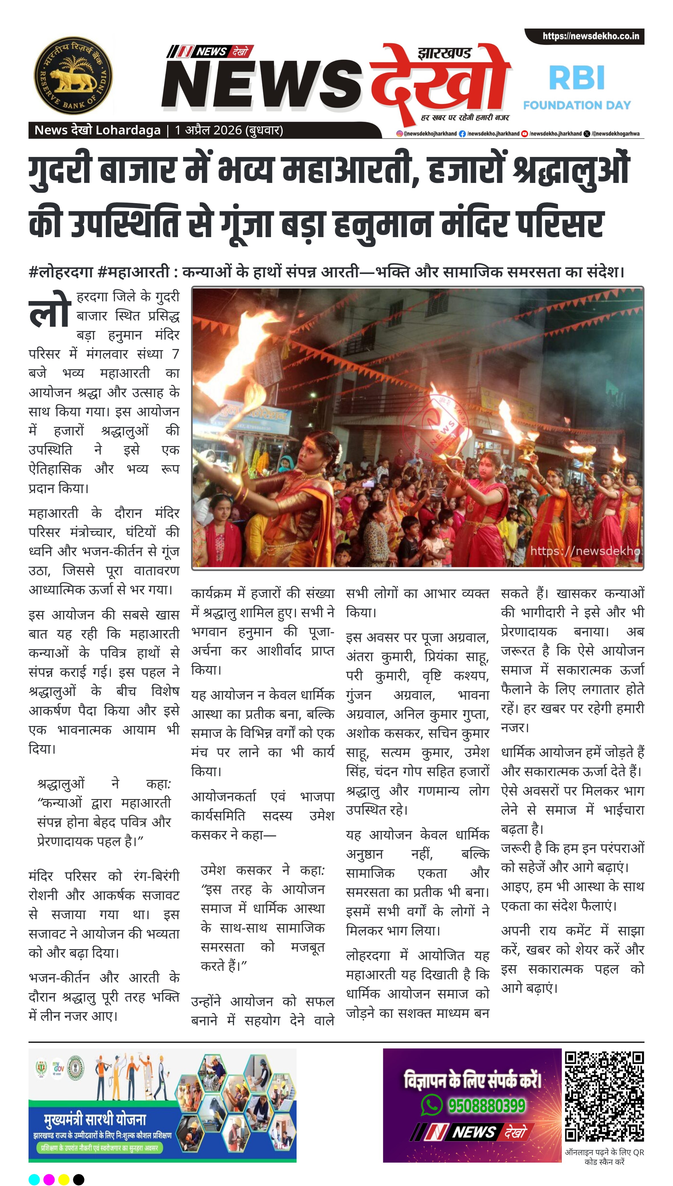लोहरदगा में आयोजित यह महाआरती यह दिखाती है कि धार्मिक आयोजन समाज को जोड़ने का सशक्त माध्यम बन सकते हैं। खासकर कन्याओं की भागीदारी ने इसे और भी प्रेरणादायक बनाया। अब जरूरत है कि ऐसे आयोजन समाज में सकारात्मक ऊर्जा फैलाने के लिए लगातार होते रहें। हर खबर पर रहेगी हमारी नजर।