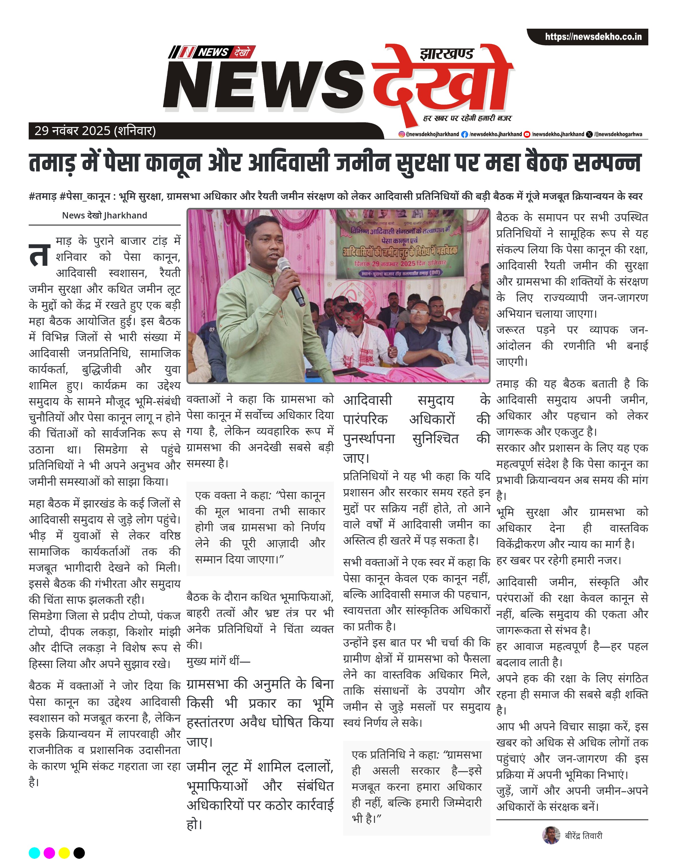 • तमाड़, रांची के पुराने बाजार टांड़ में पेसा कानून और आदिवासी जमीन सुरक्षा पर महा बैठक आयोजित हुई।
