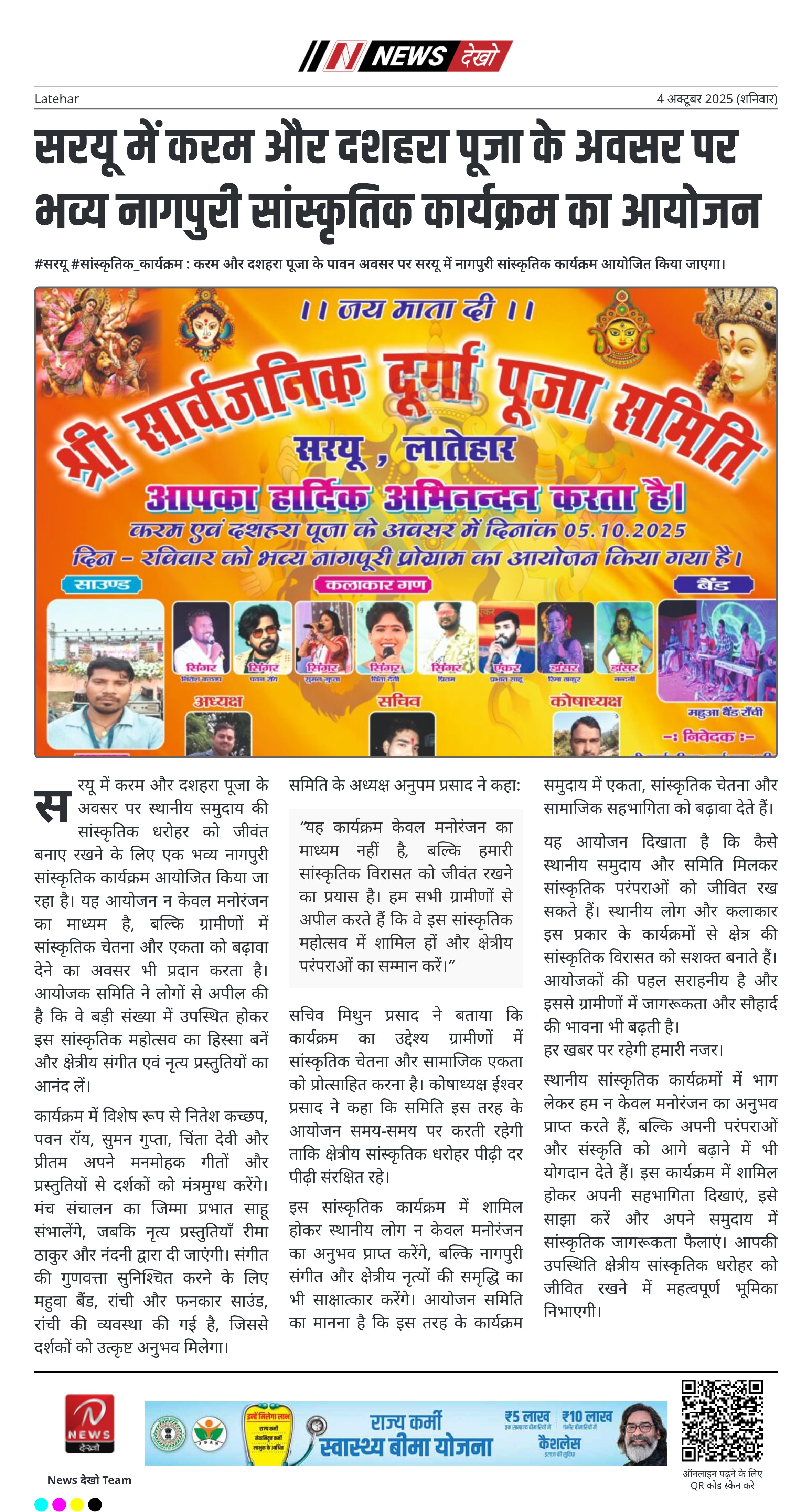 #सरयू #सांस्कृतिक_कार्यक्रम : करम और दशहरा पूजा के पावन अवसर पर सरयू में नागपुरी सांस्कृतिक कार्यक्रम आयोजित किया जाएगा।