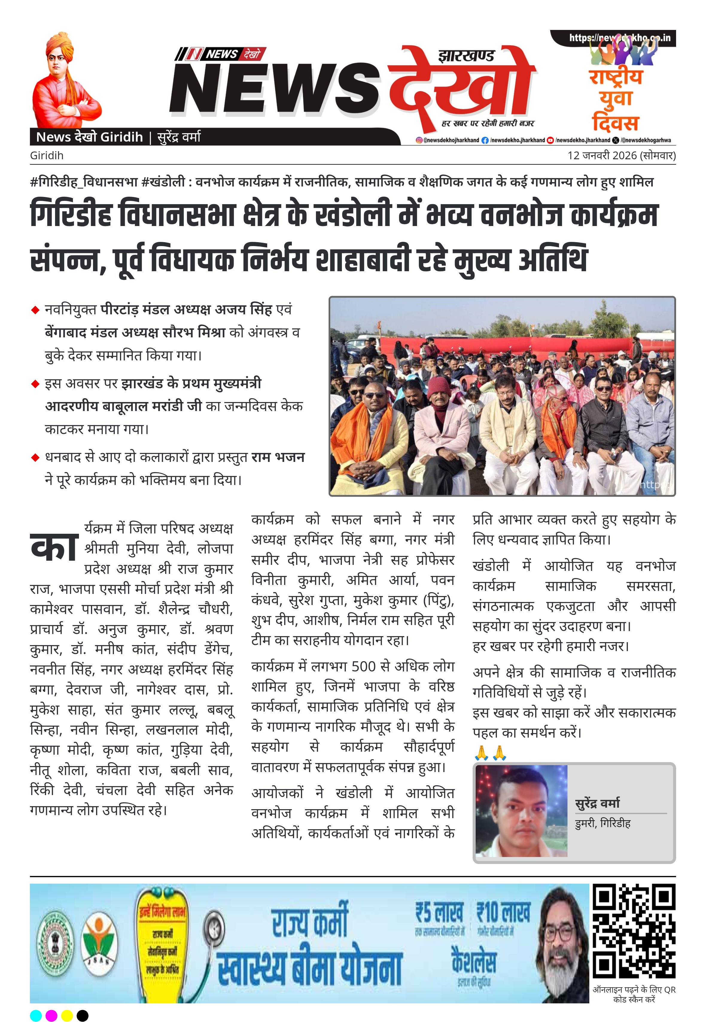 गिरिडीह विधानसभा क्षेत्र अंतर्गत खंडोली में दिनांक 11 जनवरी 2026 को आयोजित भव्य वनभोज कार्यक्रम में गिरिडीह के पूर्व विधायक एवं क्षेत्र के अभिभावक स्वरूप आदरणीय श्री निर्भय शाहाबादी जी मुख्य अतिथि के रूप में शामिल हुए। कार्यक्रम में विभिन्न राजनीतिक दलों के नेता, जनप्रतिनिधि, शिक्षाविद्, चिकित्सक एवं समाज के गणमान्य लोग बड़ी संख्या में उपस्थित रहे।